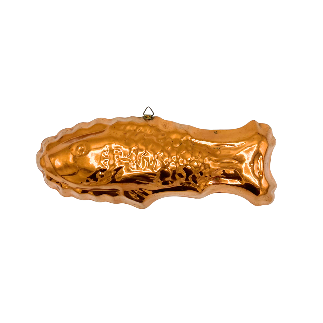 Vintage copper fish mold. Small hook for hanging. Spots of patina and discoloration consistent with age. Measures 12" long.
