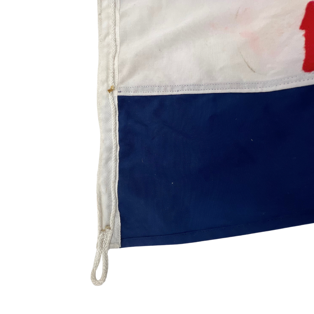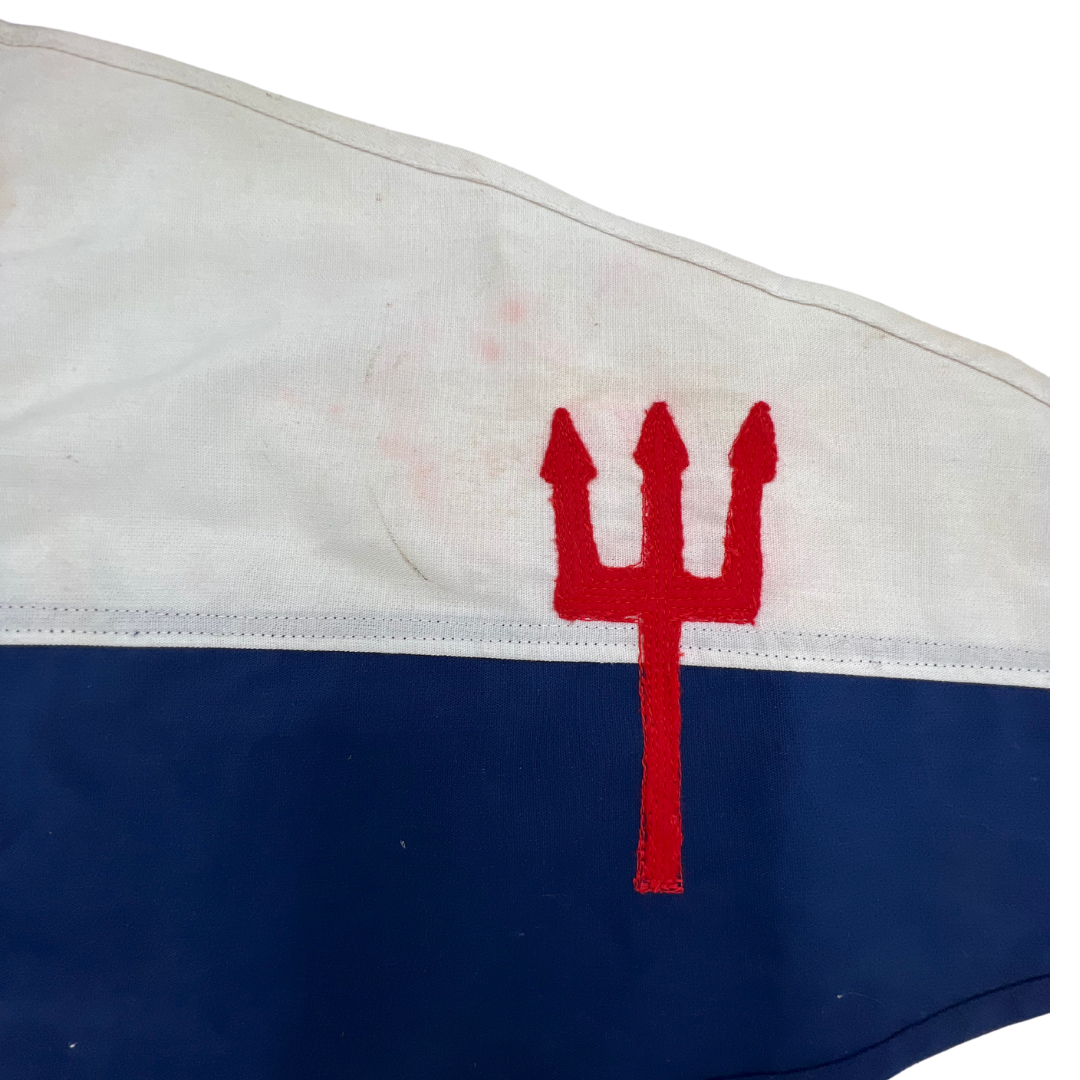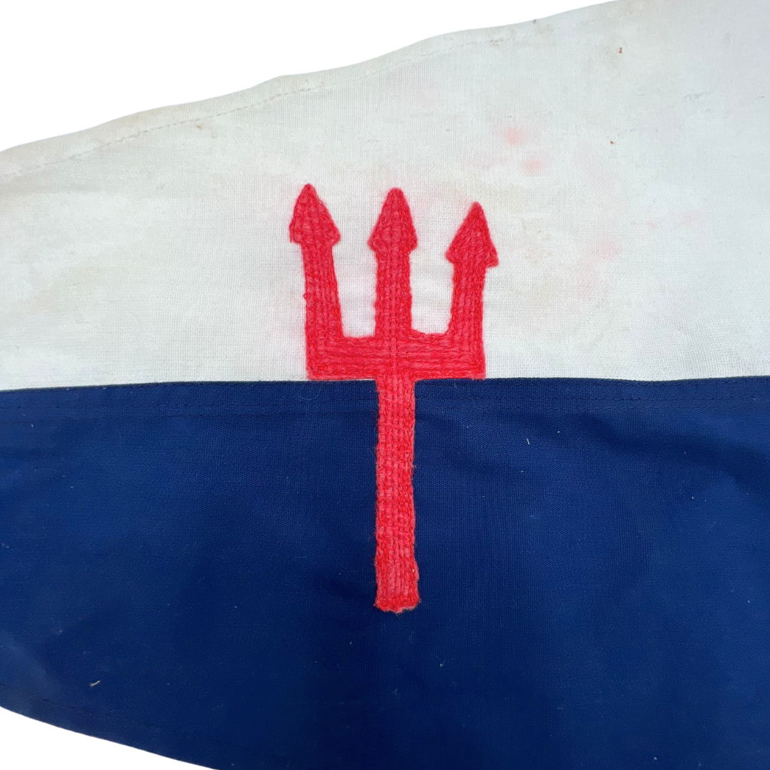 Vintage cotton burgee/nautical flag. Nylon cord, stitched emblem. Association unknown. Slight wear and color bleeding. Approximately 22" long.