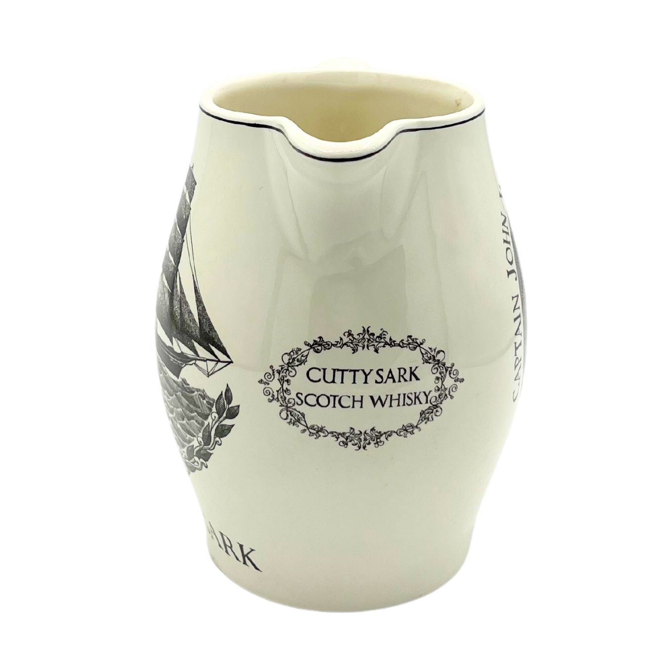 Vintage Cutty Sark scotch whiskey ceramic pitcher featuring Captain John Willis. Good vintage condition. Approximately 6.5" tall x 7.5" wide.