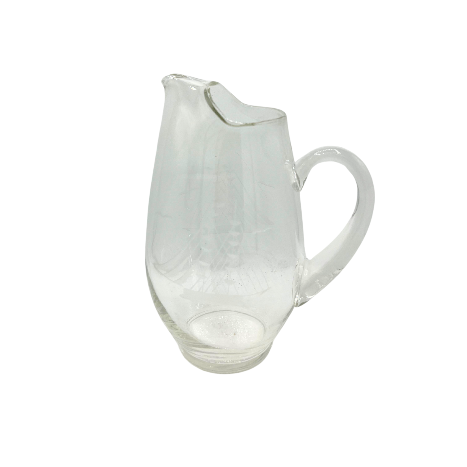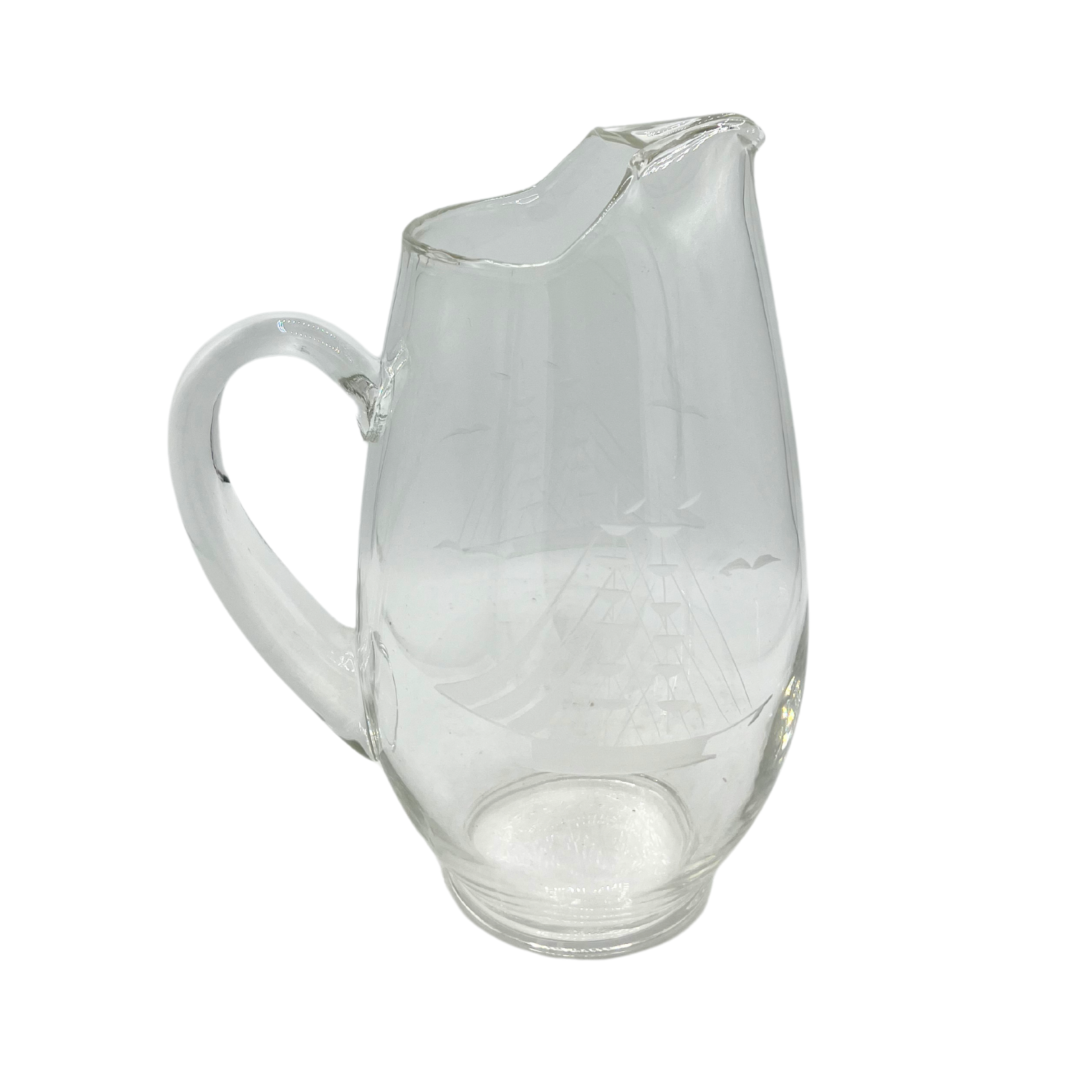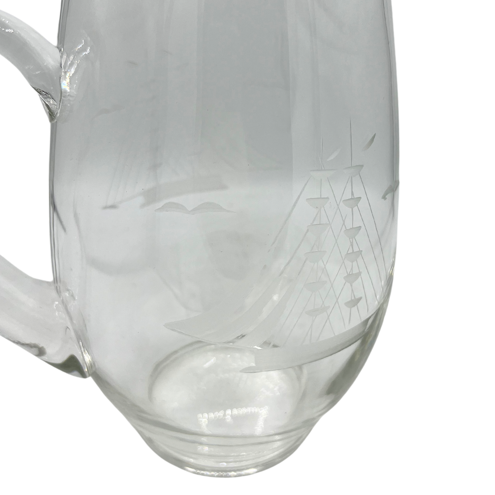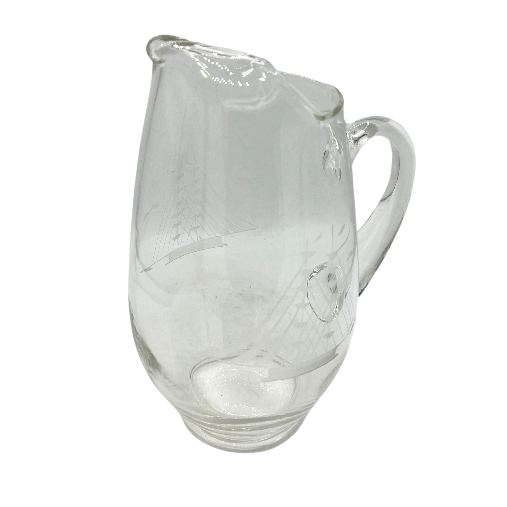 Vintage clear glass pitcher etched with ships on either side. Appears handmade. Good vintage condition. Heavy and solid - over 2.5 lbs. Stands 10.25" tall.