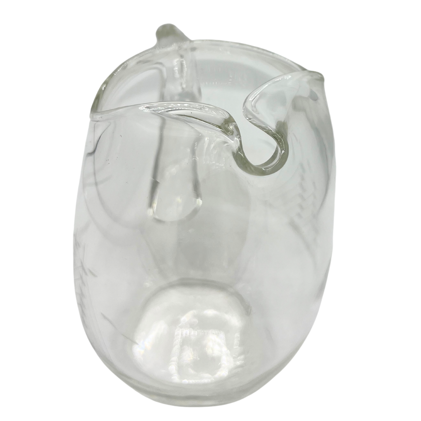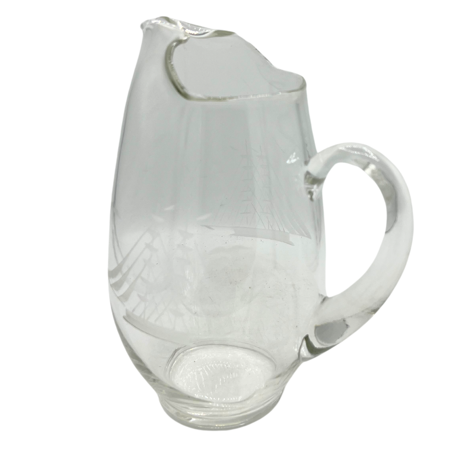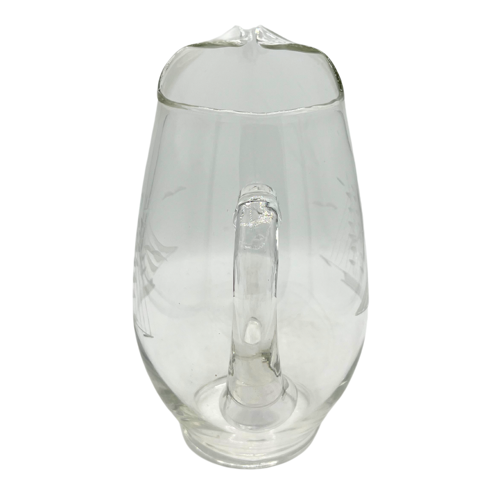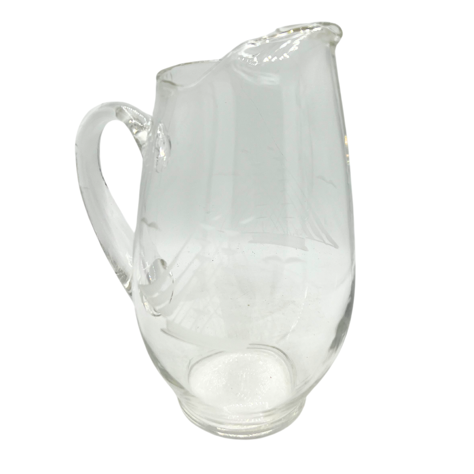 Vintage clear glass pitcher etched with ships on either side. Appears handmade. Good vintage condition. Heavy and solid - over 2.5 lbs. Stands 10.25" tall.