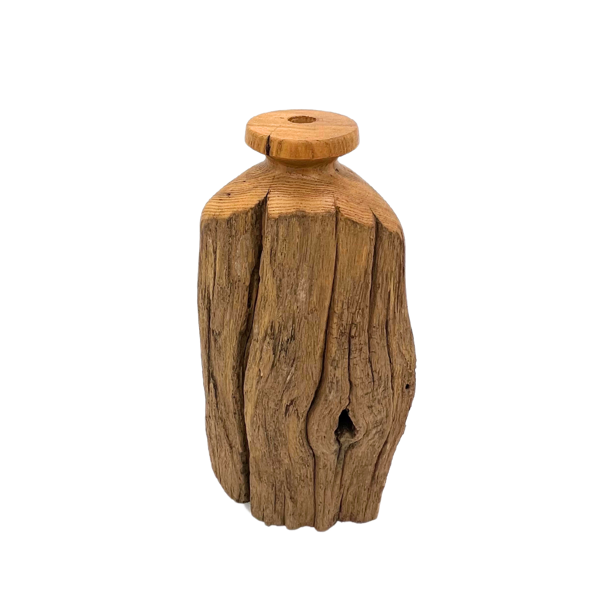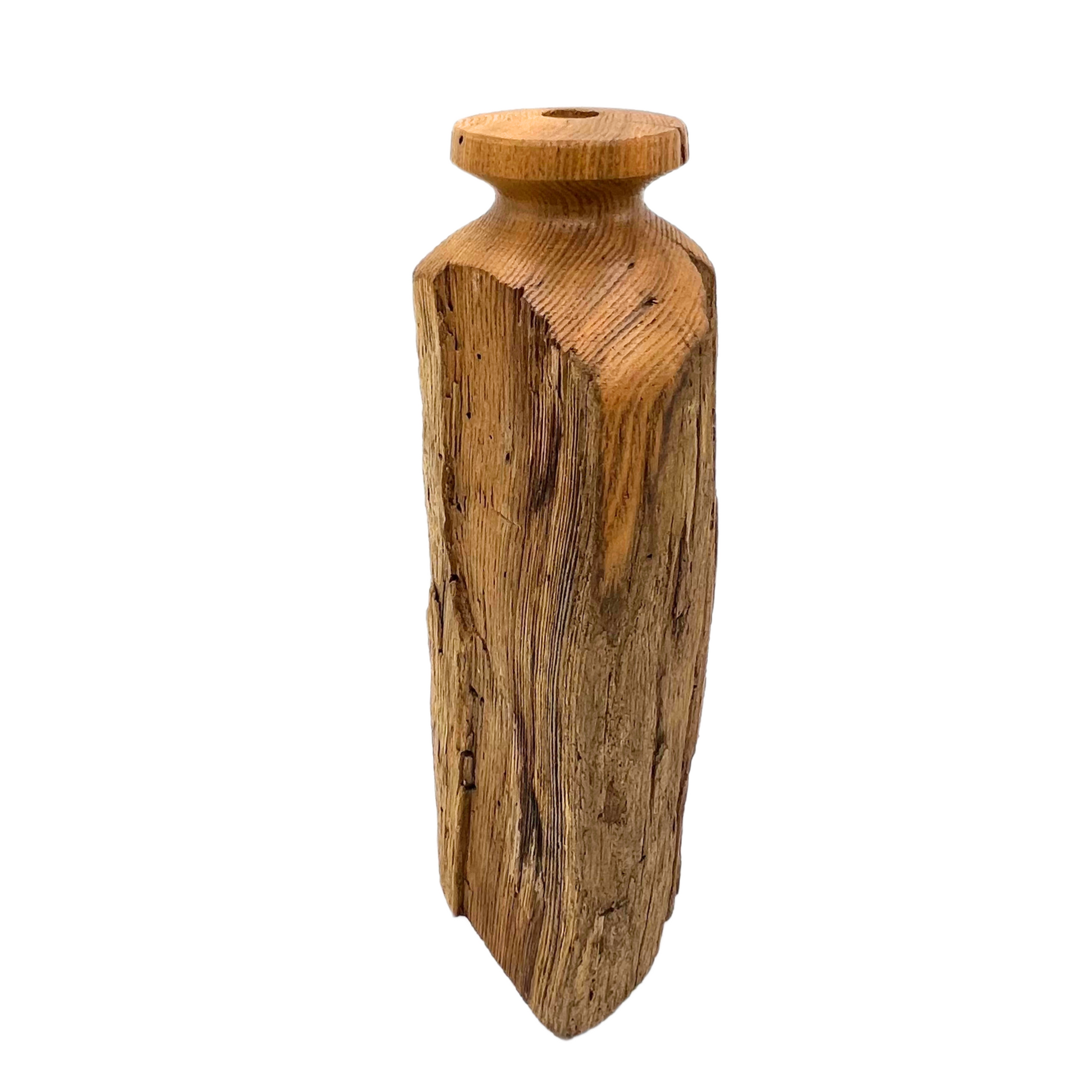 Interesting natural wood bud vase. Handcrafted from a firewood log. Unique and rustic vase. Approximately 12" tall.