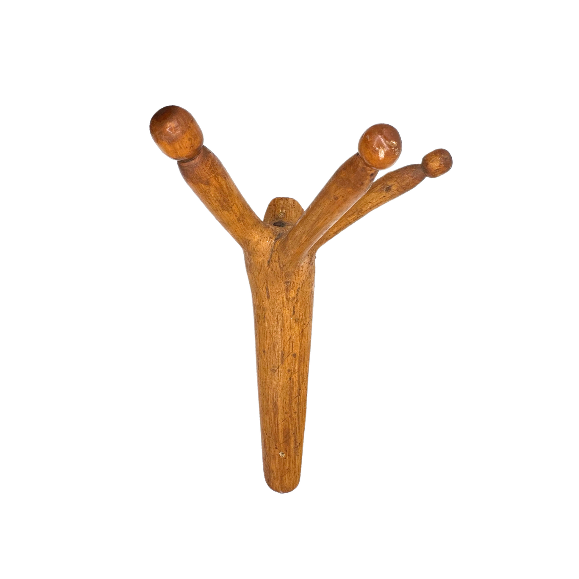 Interesting coat rack made from a single piece of wood. Hand-carved. Some minor scuffs and dings due to age. About 17" tall.