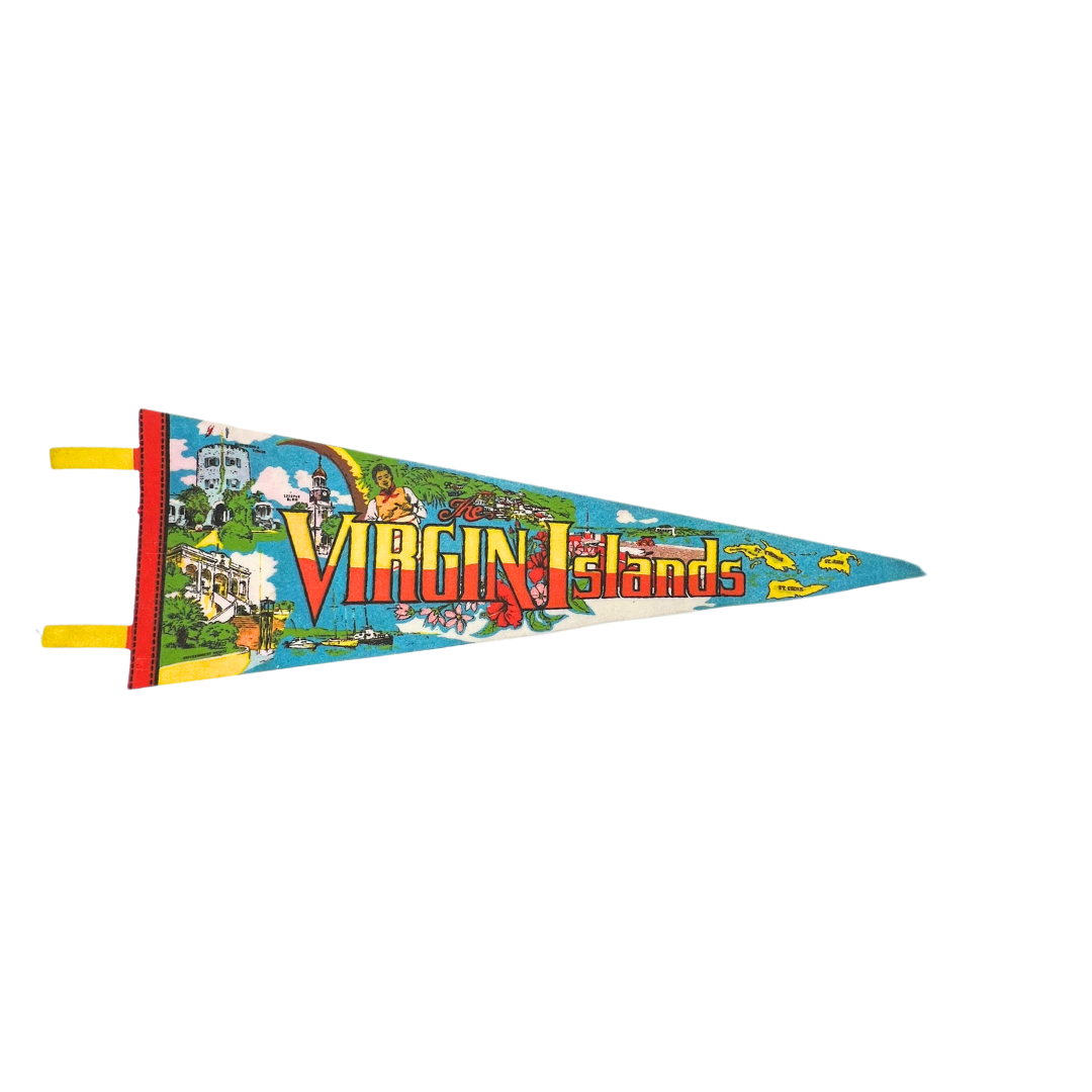 Vintage Virgin Islands souvenir felt pennant. Very good vintage condition. Approximately 27" across including tabs.