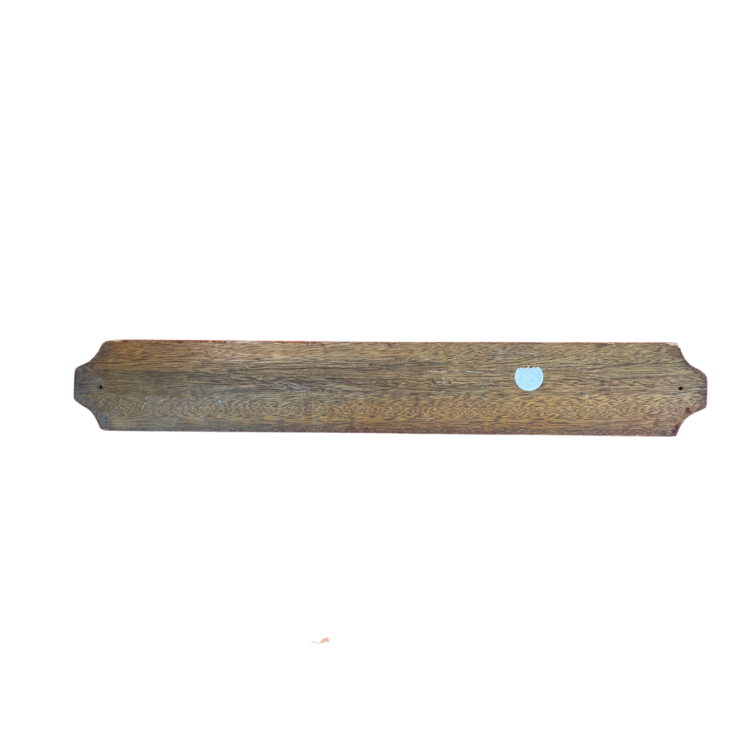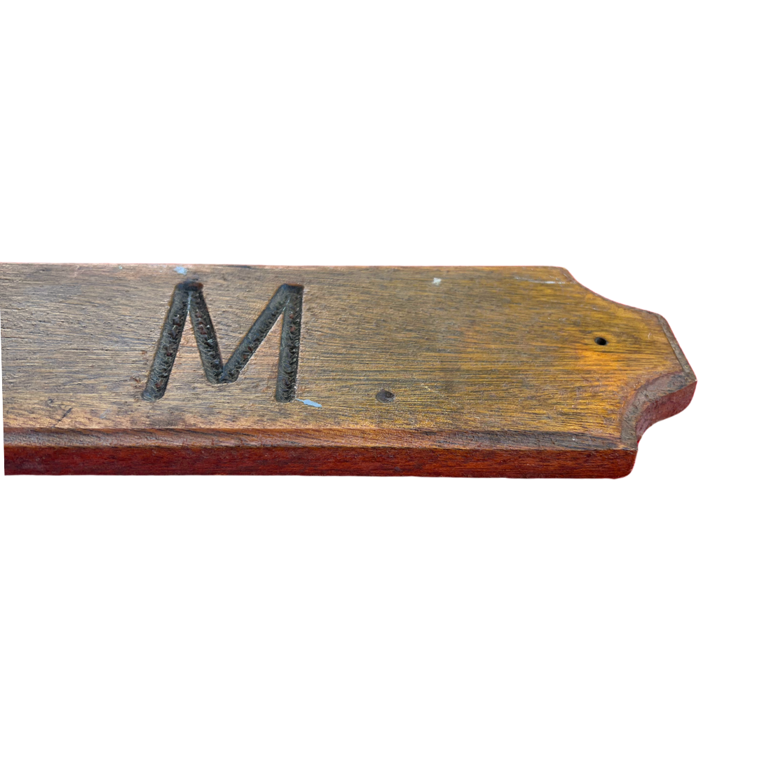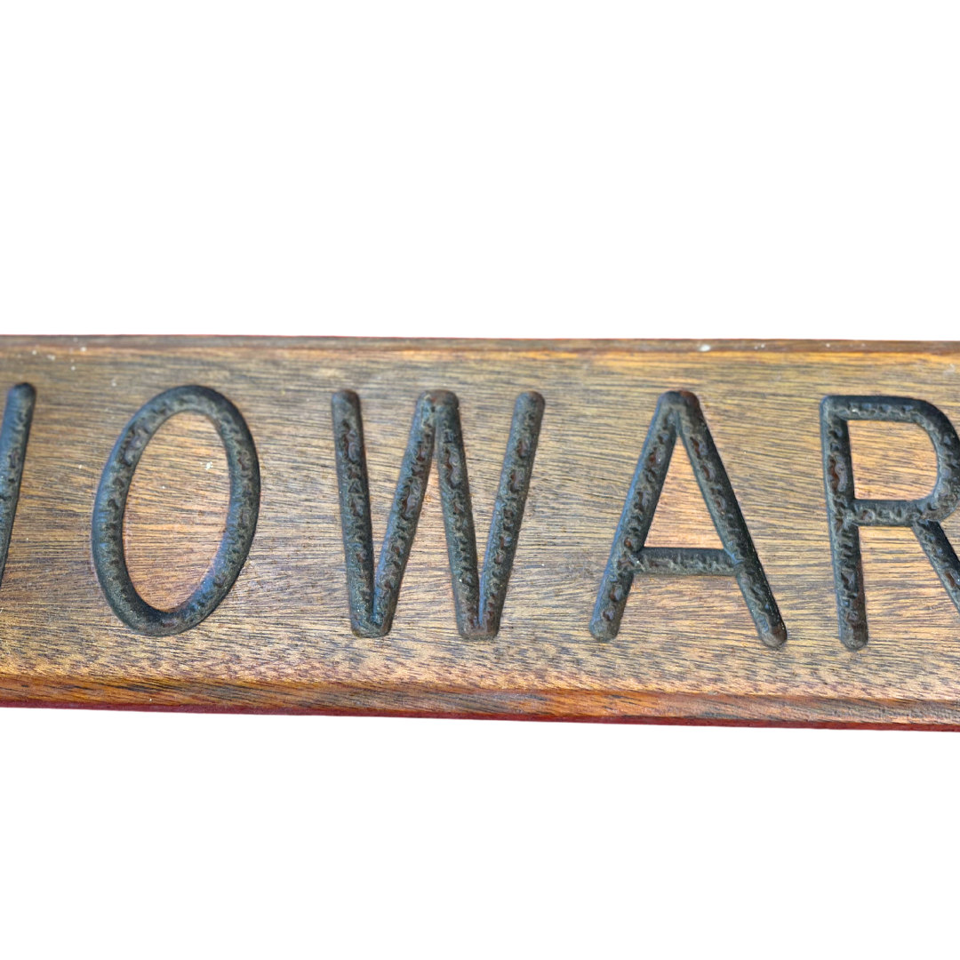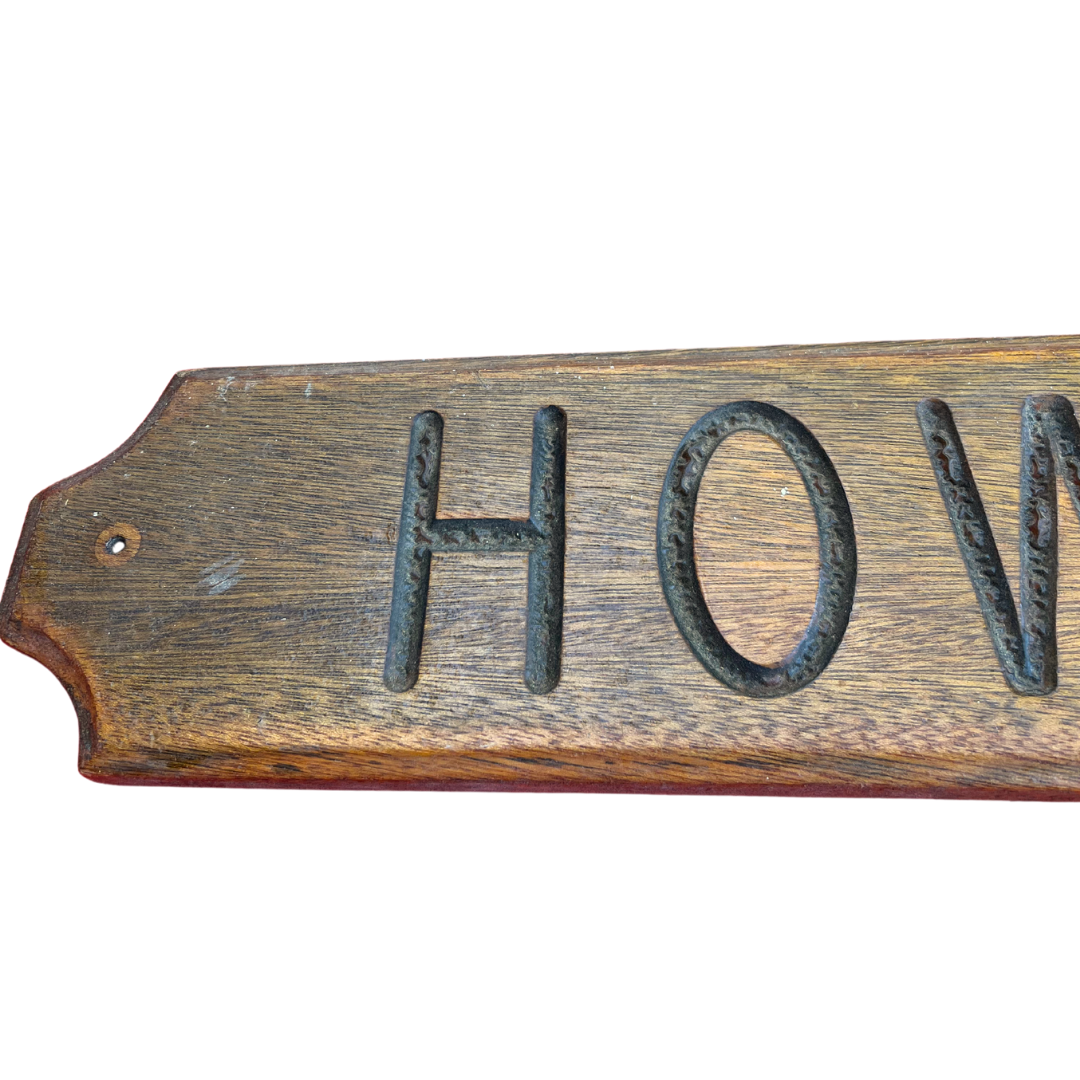 Wooden boat name sign/quarterboard. Sign is carved with the name "Howard M". Estimated mid-century. Wear/weathering consistent with age. Approximately 34.25" long.