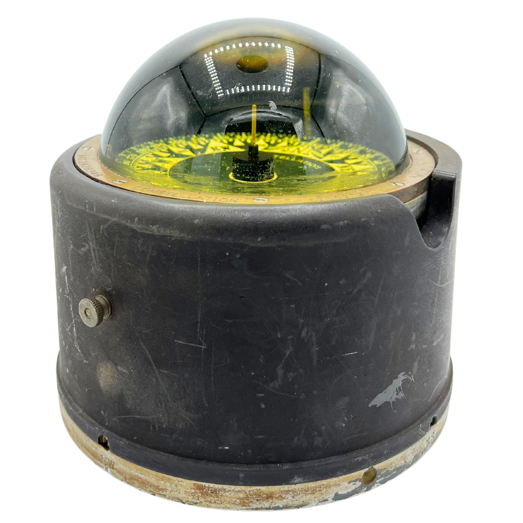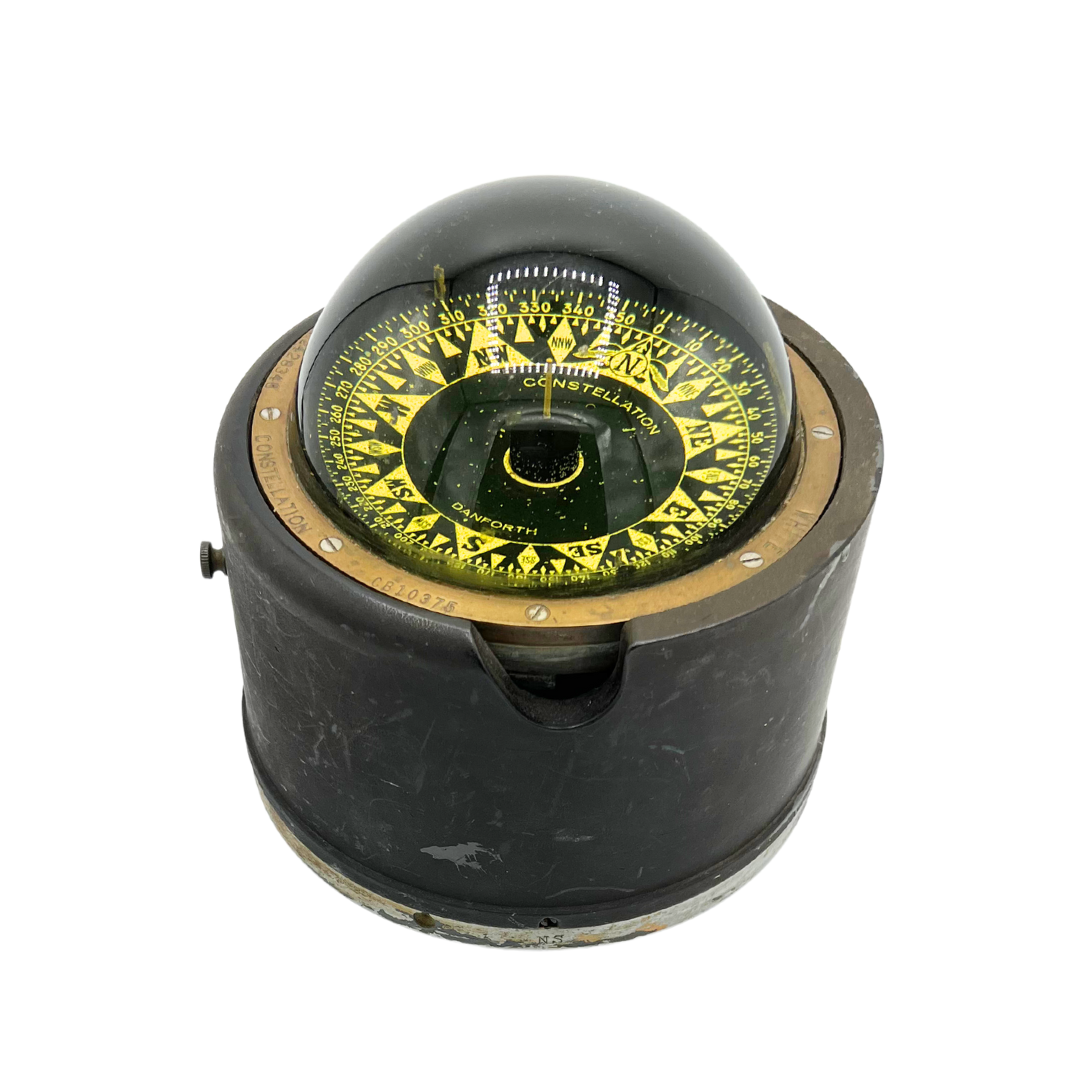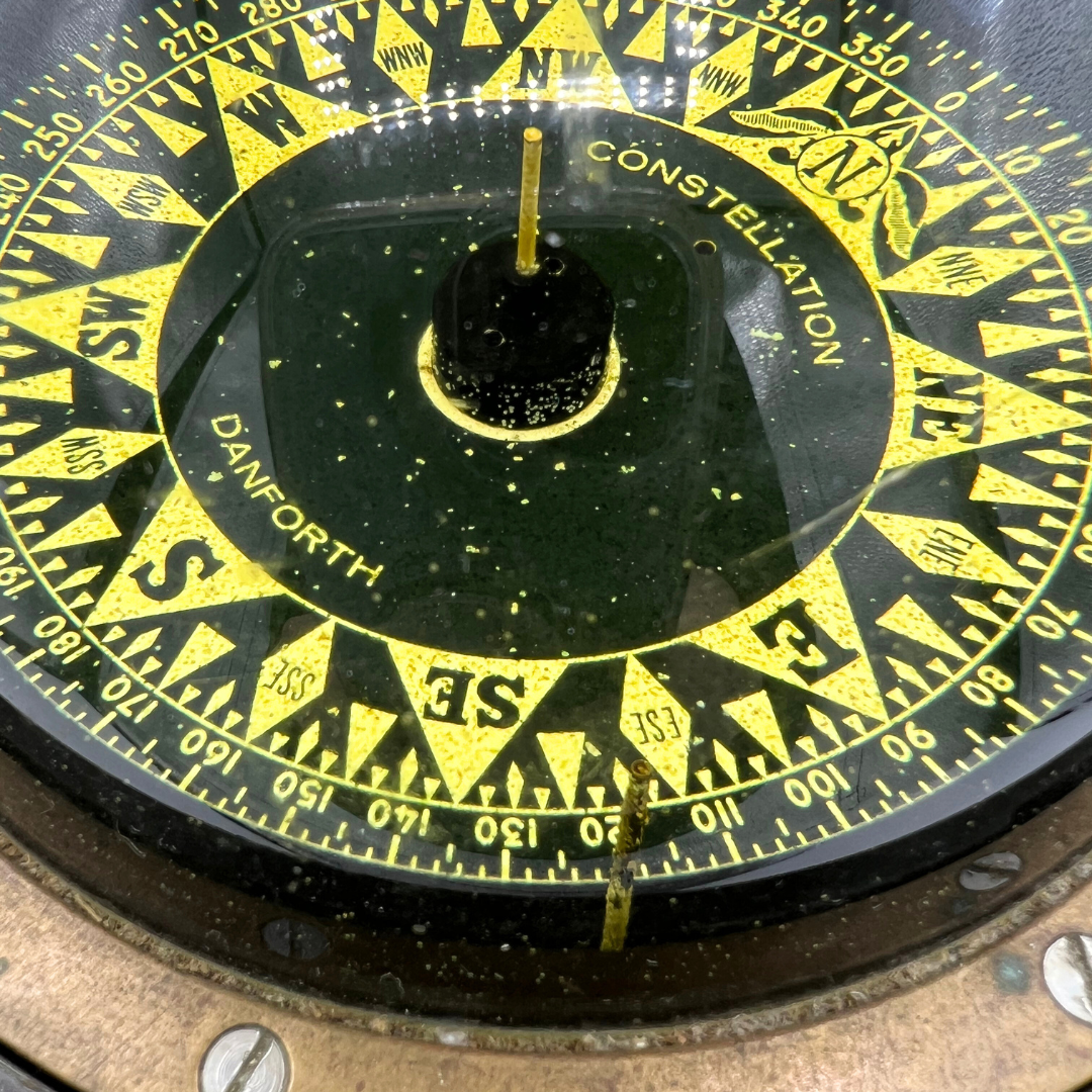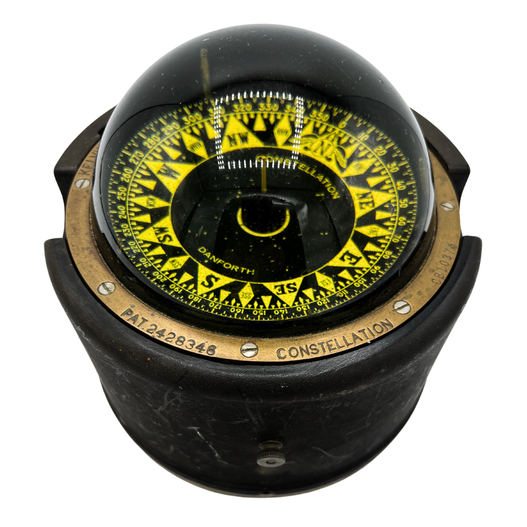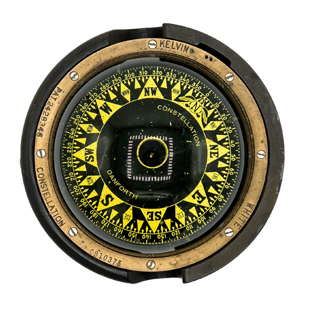 Vintage Kelvin White constellation marine navigation compass. Functionality and exact age unknown. Compass surfaces rotates in globe when moved. Interesting marine salvage piece. Approximately 6.5" wide x 6.5" tall.