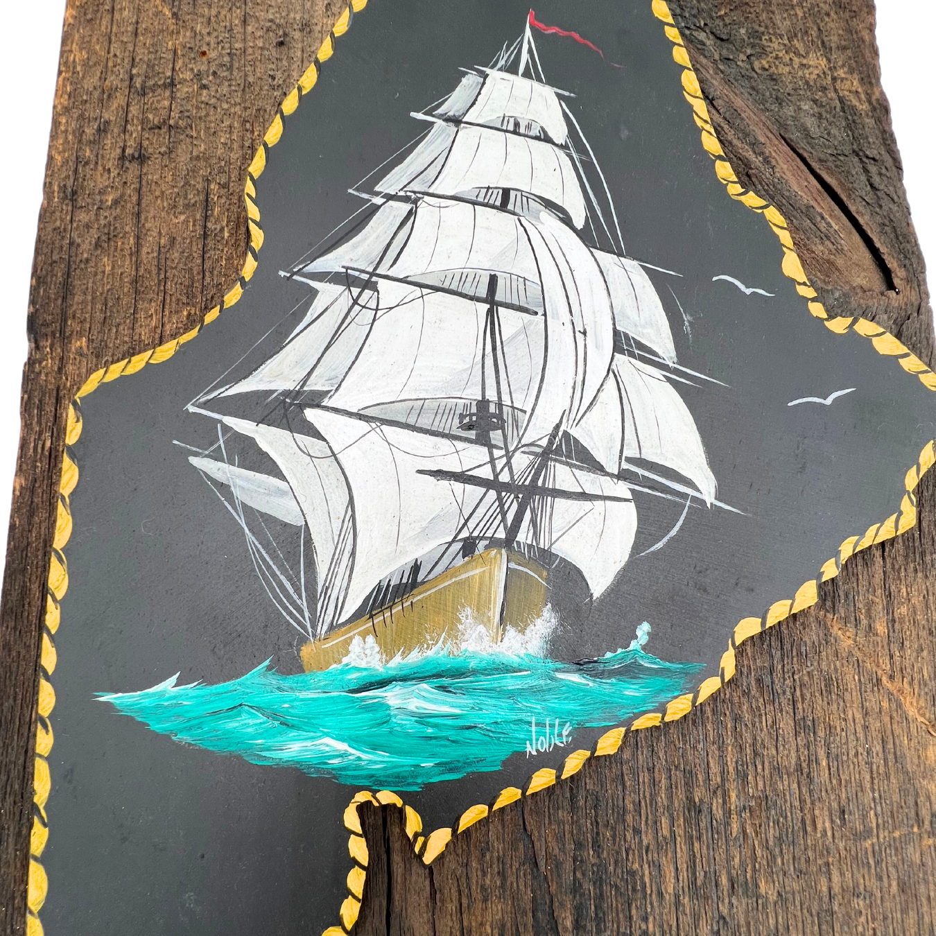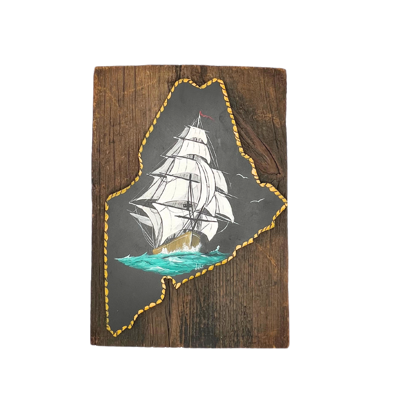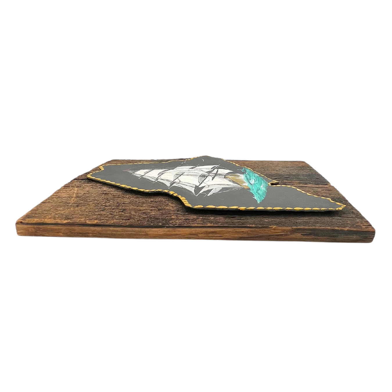 Vintage wall hanging estimated 1970s-1980s. Piece of slate shaped like Maine affixed to a piece of raw wood. Ship scene hand-painted on slate. Approximately 15.5" x 11".
