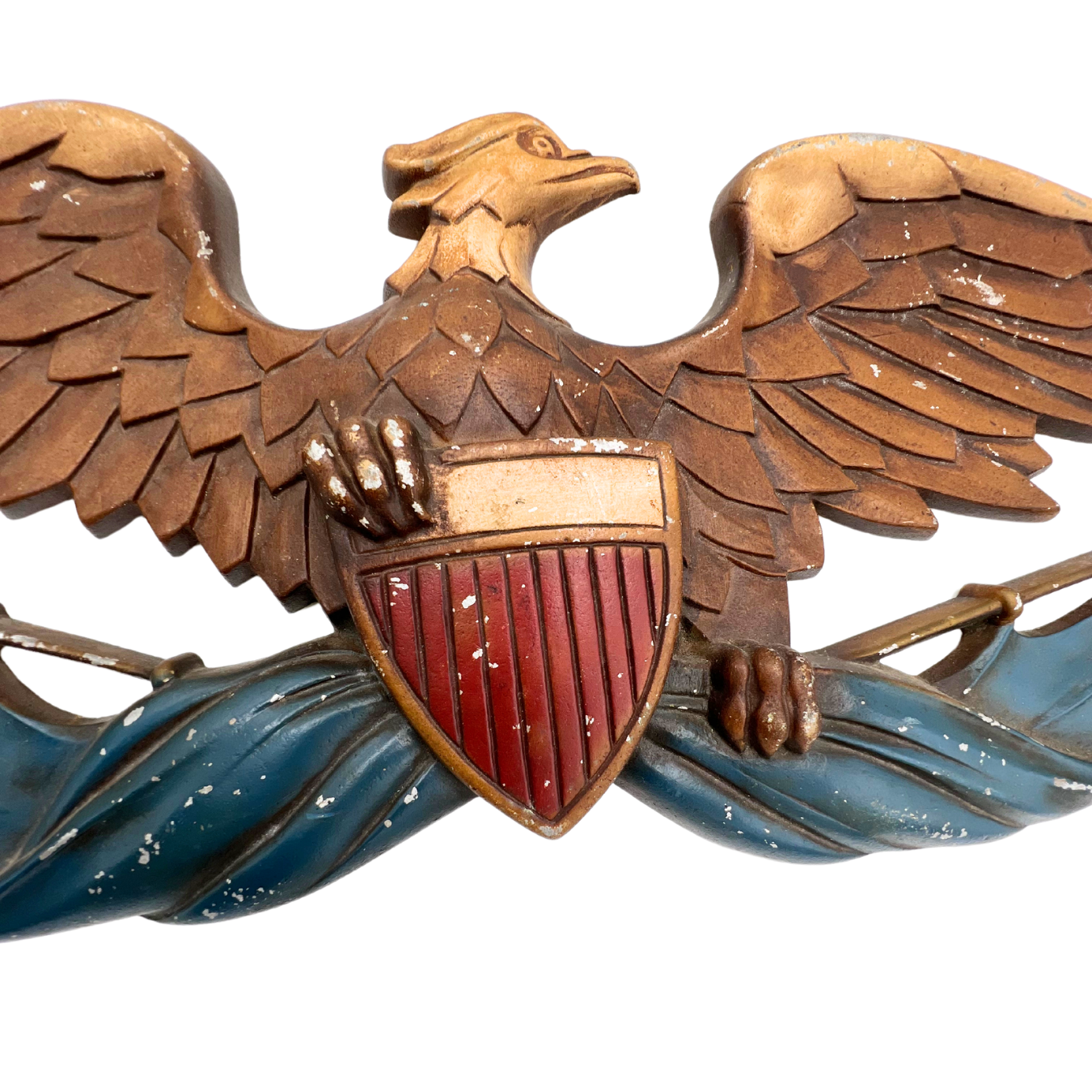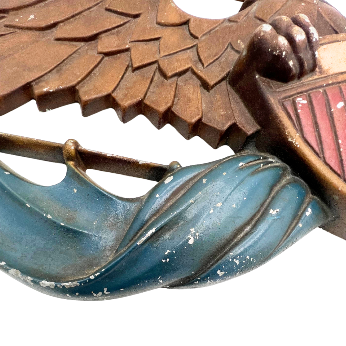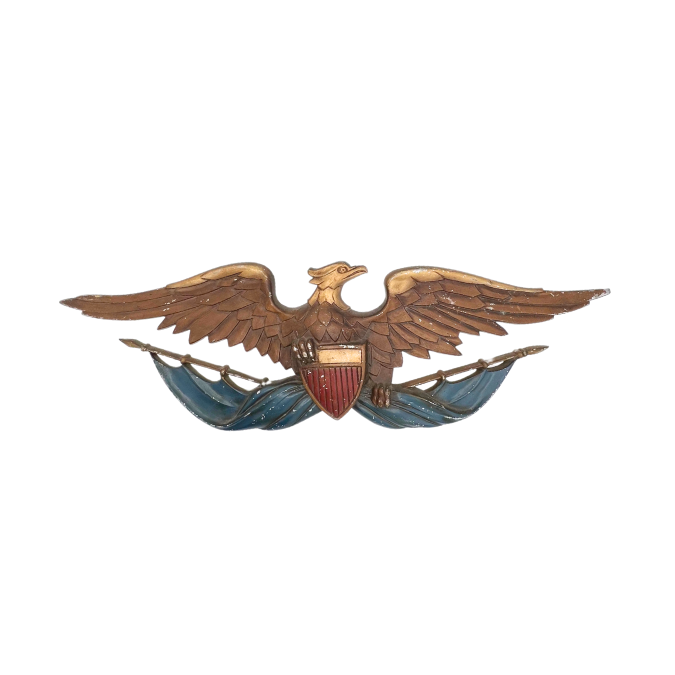 Vintage painted metal wall hanging by Sexton USA. Federal style eagle with a shield/crest. Estimated 1970s or earlier. Wear (including worn off paint) consistent with age. Hardware built into the back. Approximately 27.5" wide.