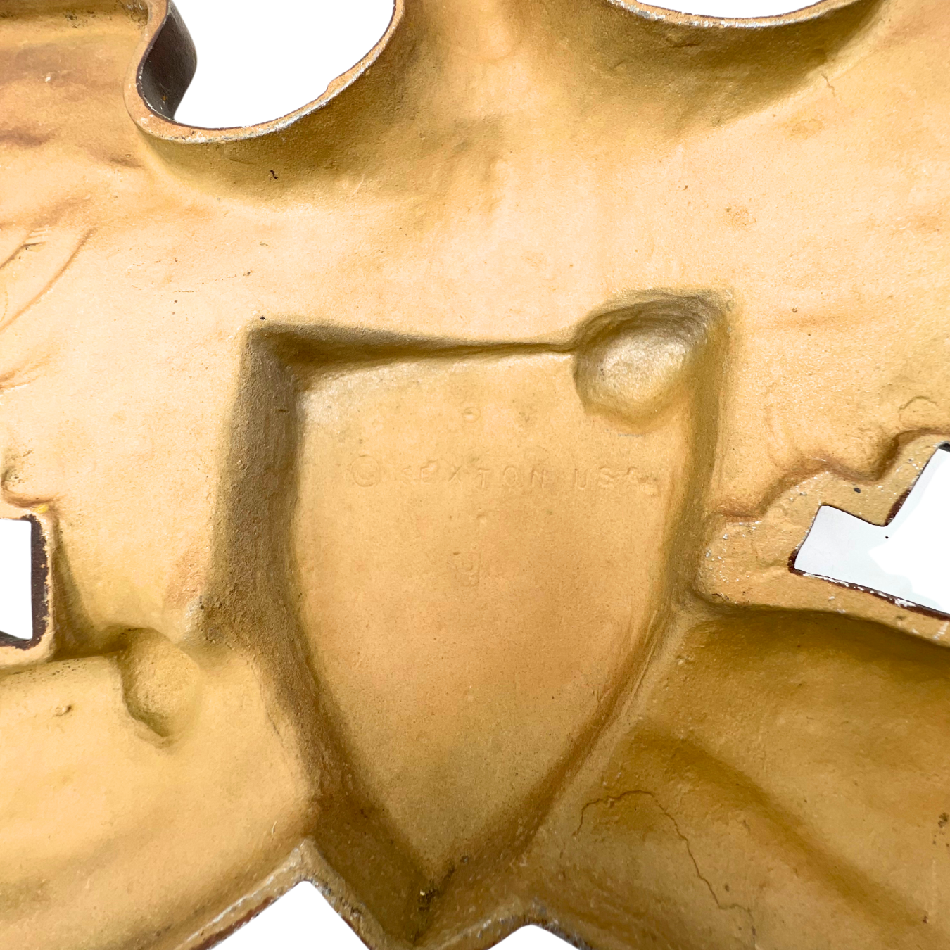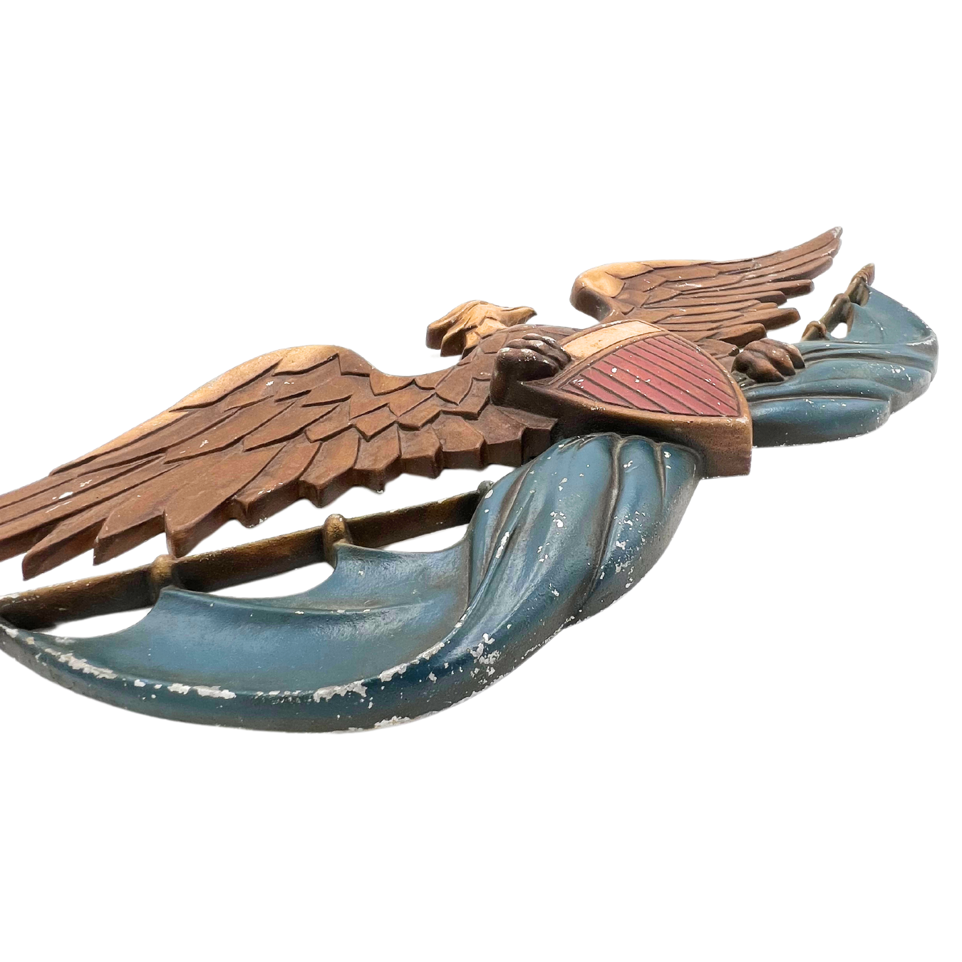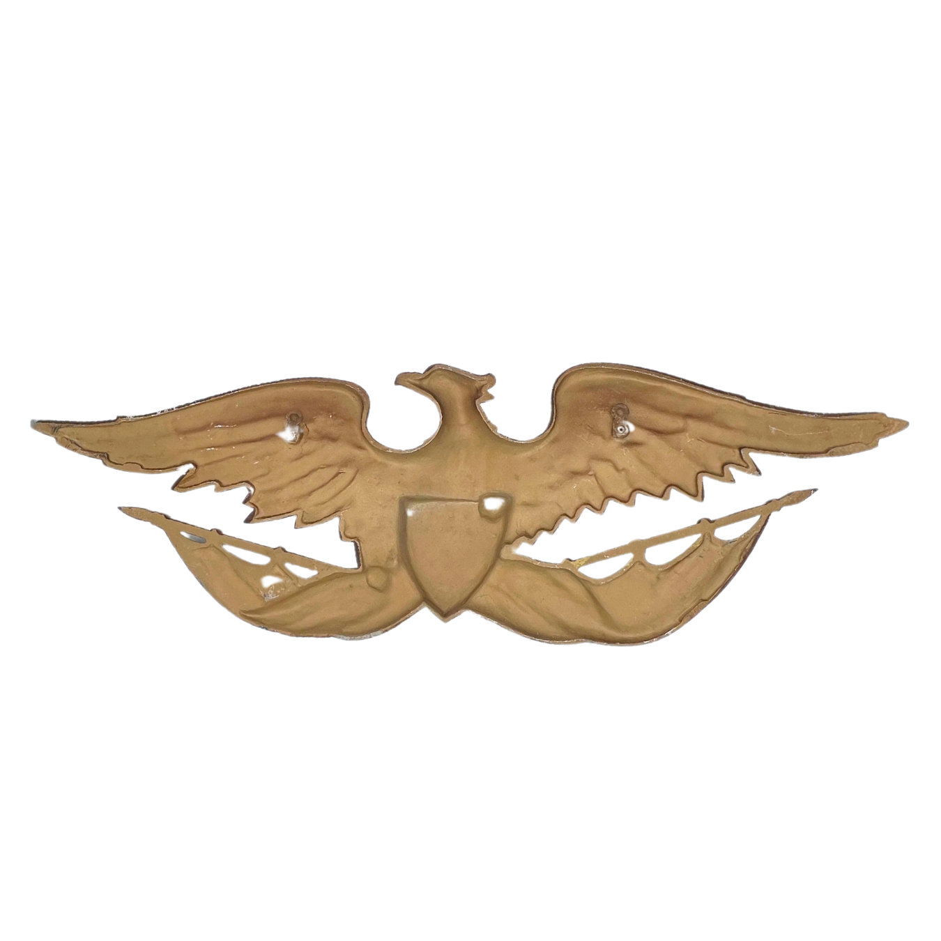 Vintage painted metal wall hanging by Sexton USA. Federal style eagle with a shield/crest. Estimated 1970s or earlier. Wear (including worn off paint) consistent with age. Hardware built into the back. Approximately 27.5" wide.