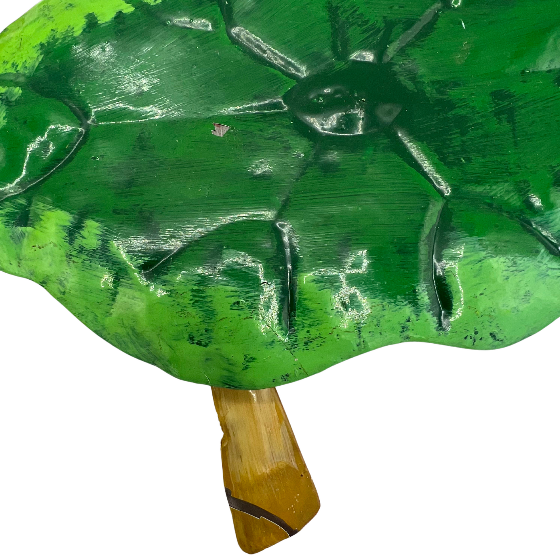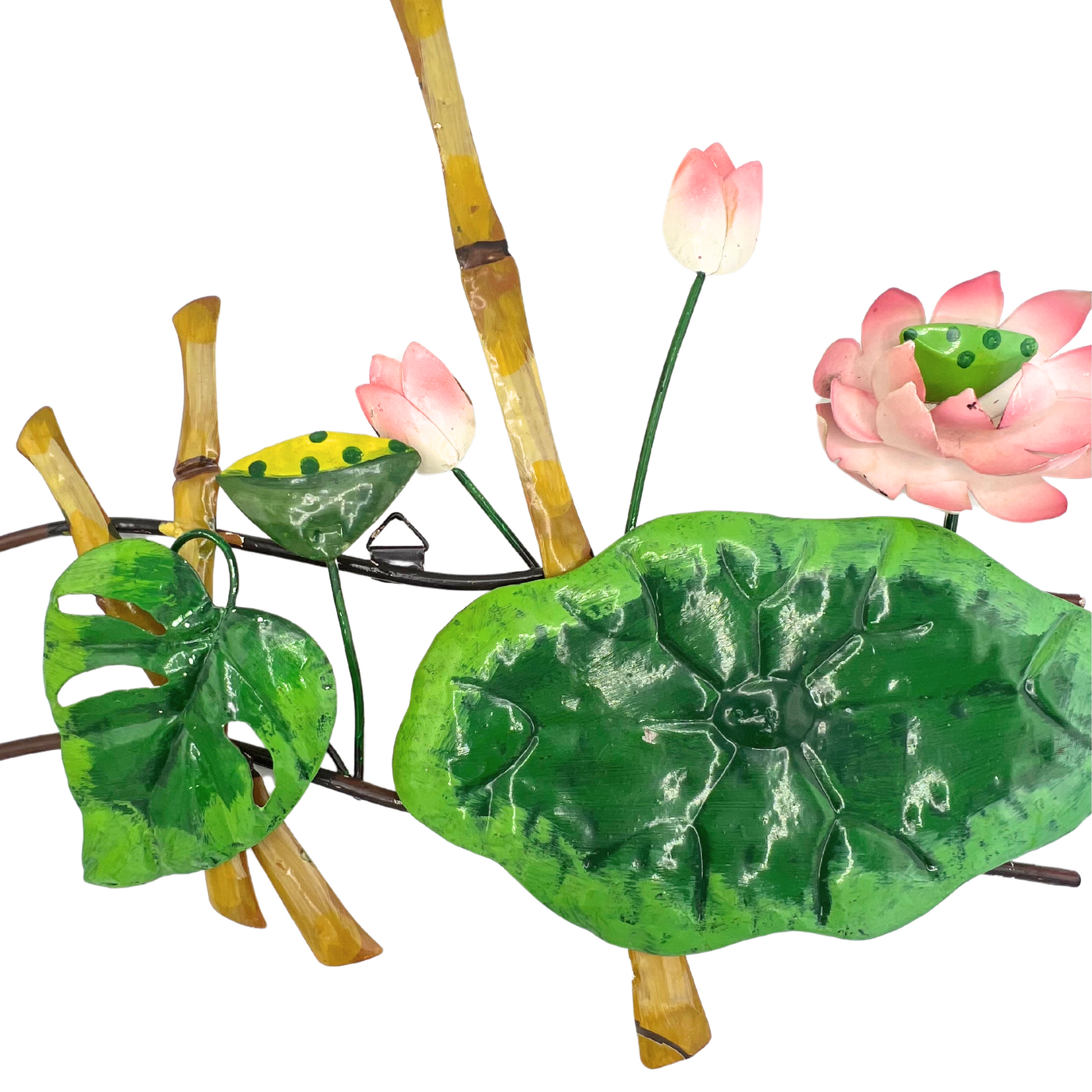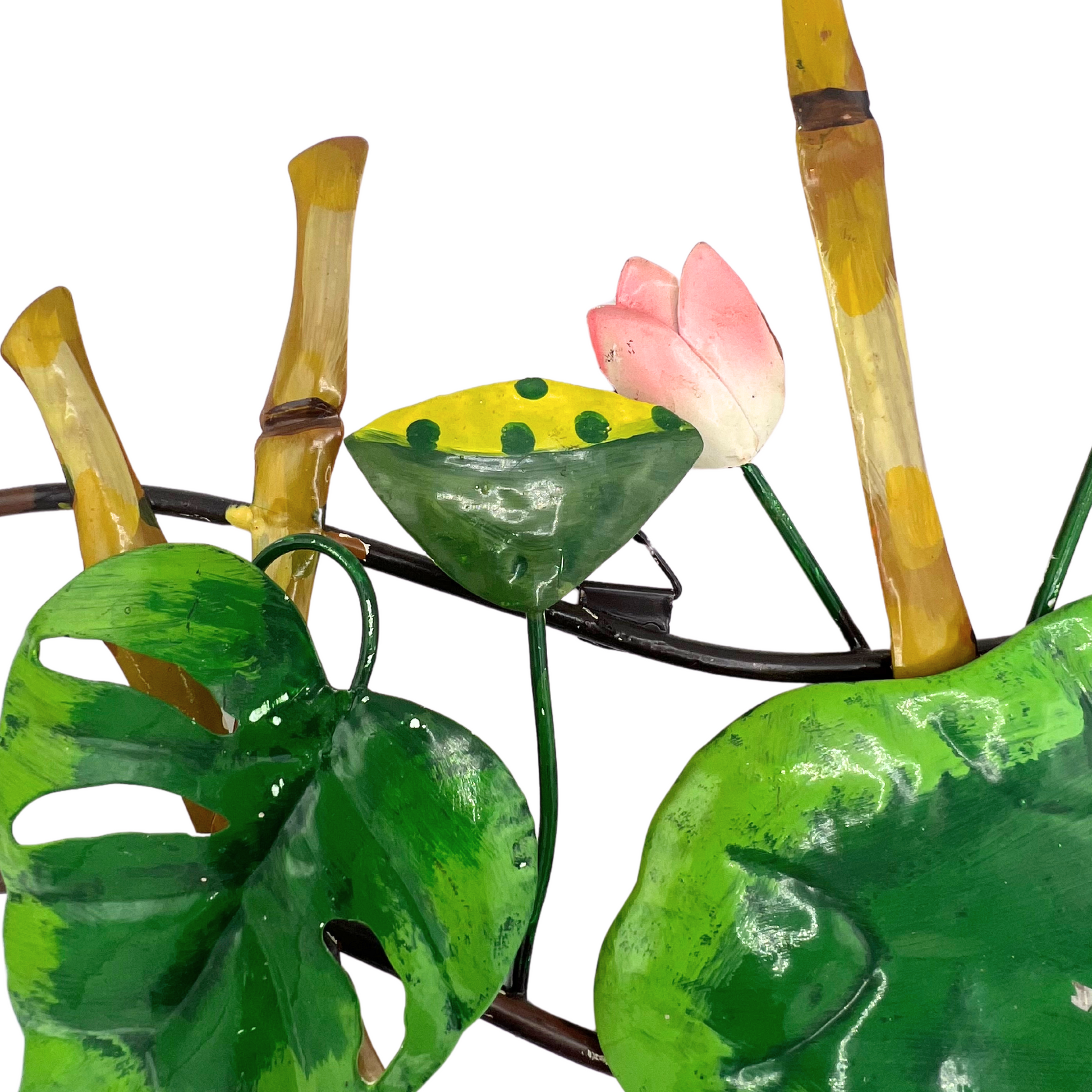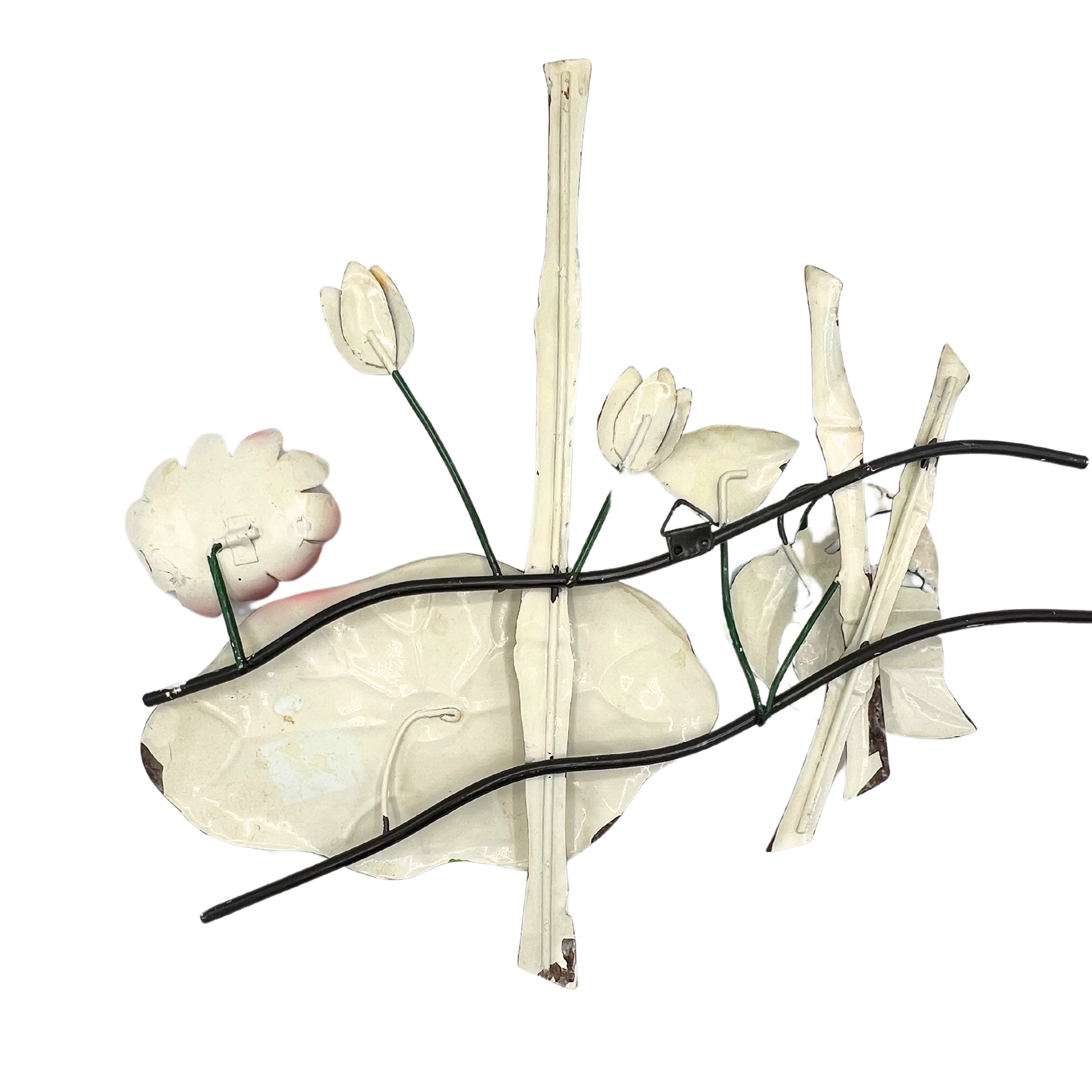 Unique vintage metal wall hanging. Reminiscent of lily pad with flowers. Some wear from age - see photos where paint is cracked and chipped. Hook for hanging. About 16" across.