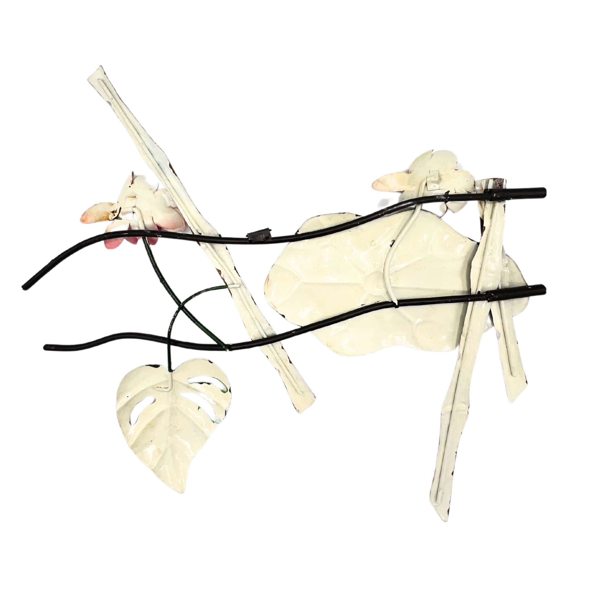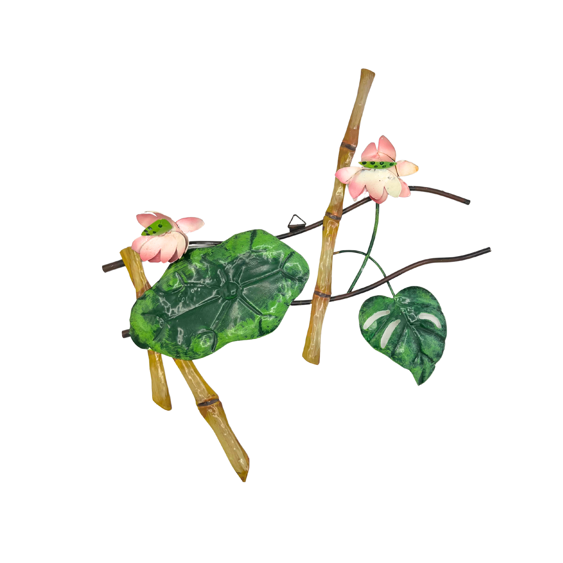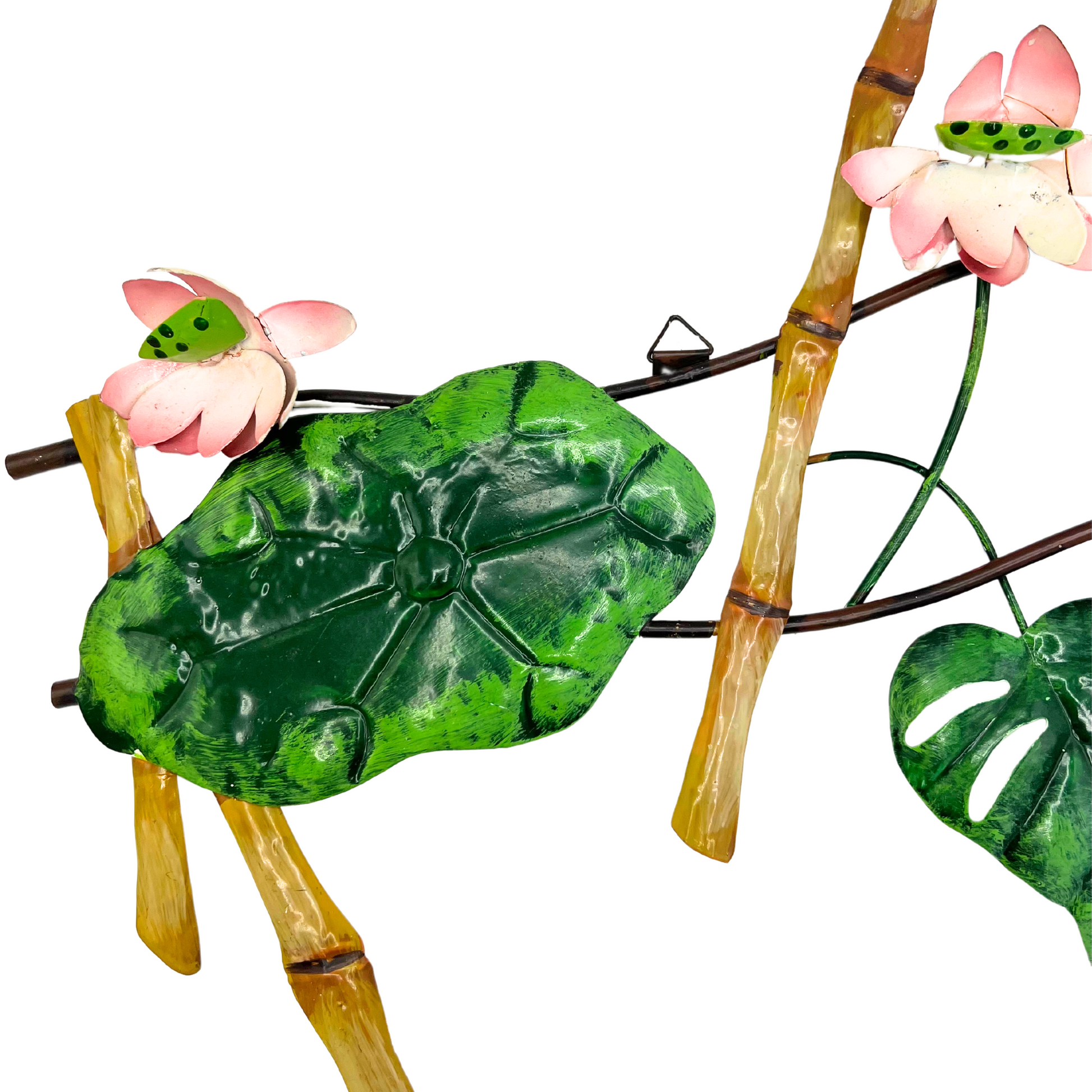 Unique vintage metal wall hanging. Reminiscent of lily pad with flowers. Some wear from age - see photos where paint is chipped and cracked. Hook for hanging. About 15" across.