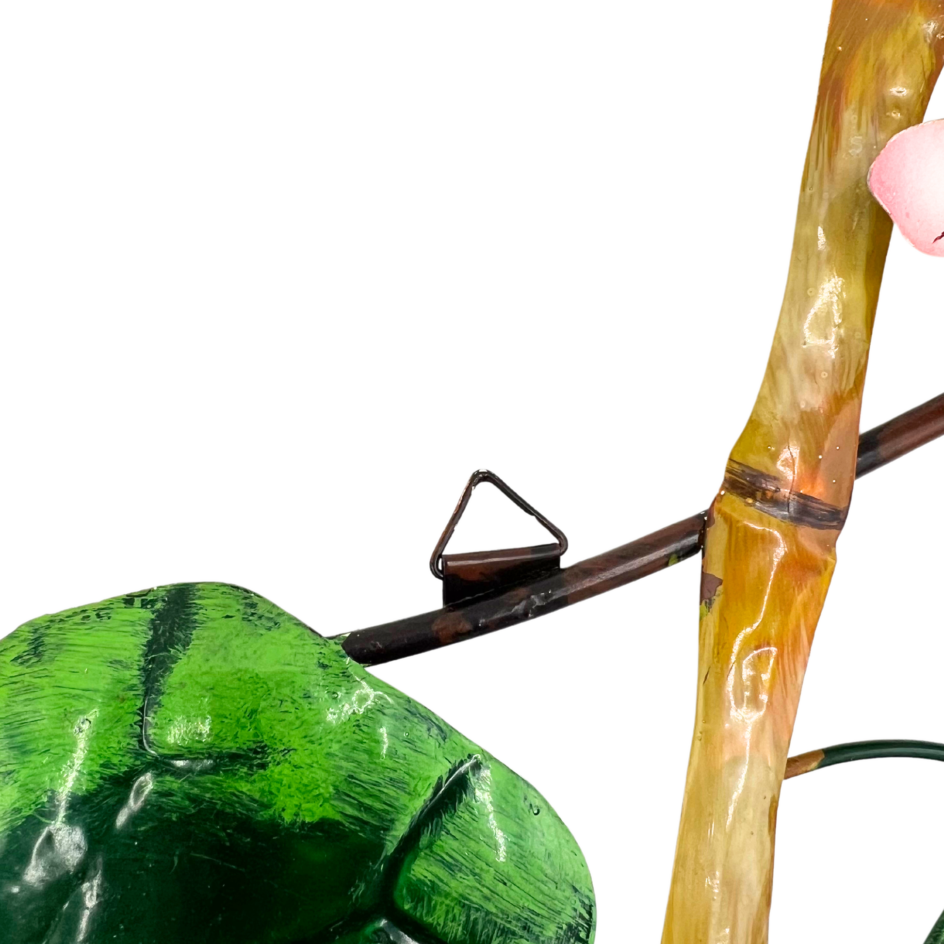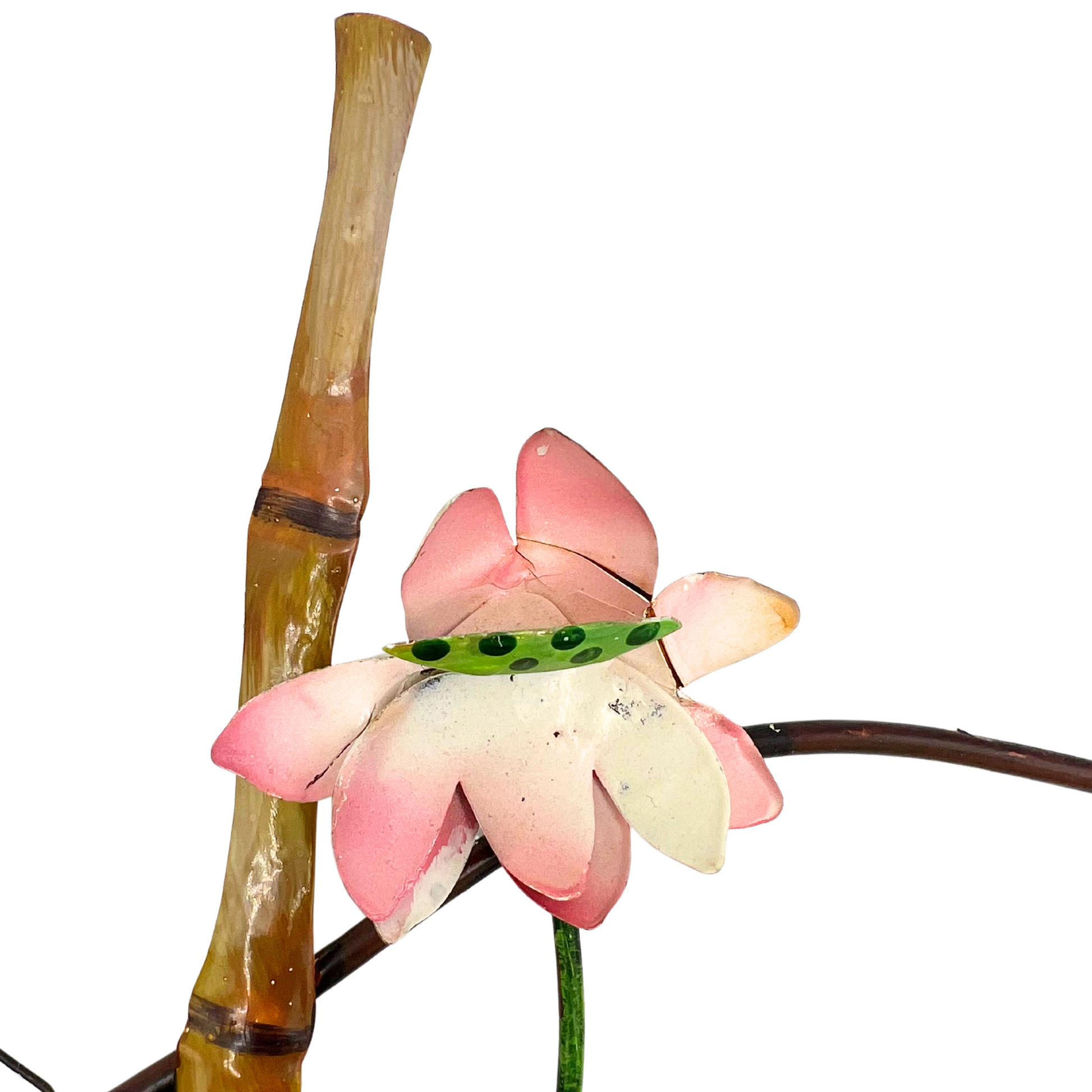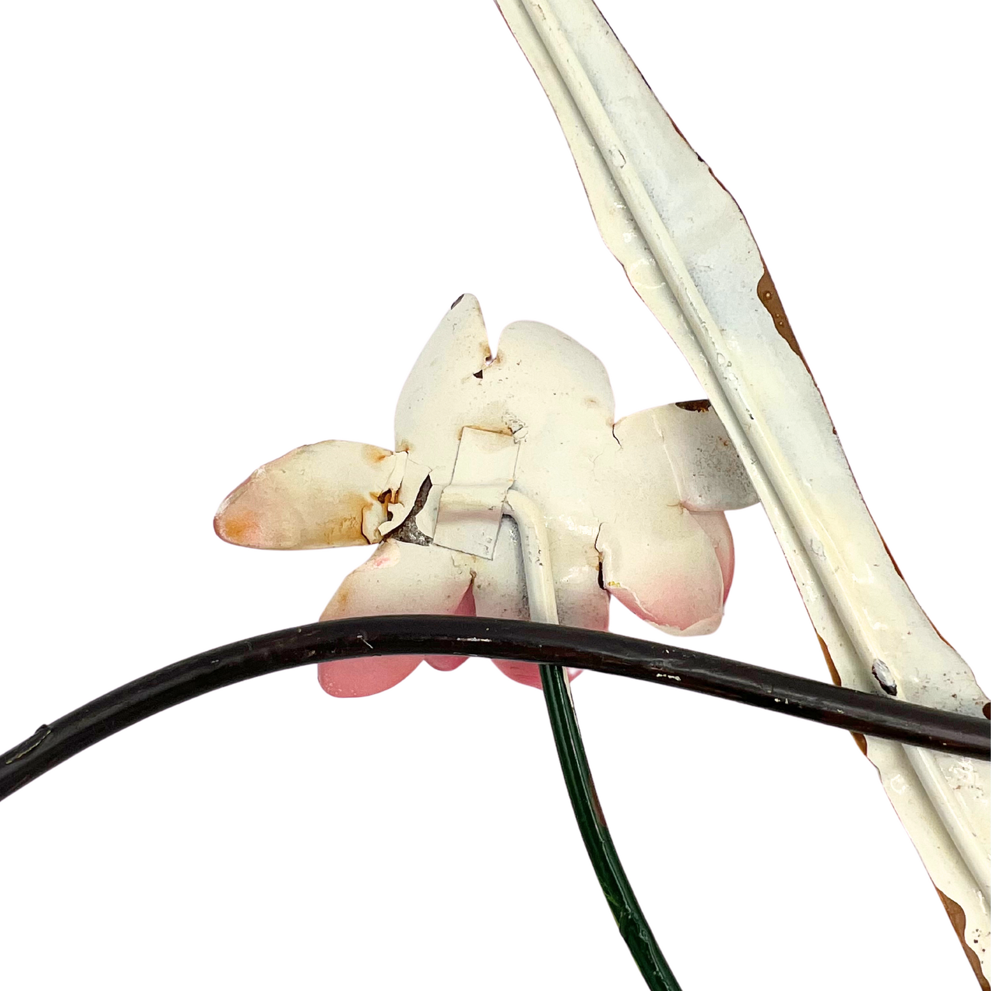 Unique vintage metal wall hanging. Reminiscent of lily pad with flowers. Some wear from age - see photos where paint is chipped and cracked. Hook for hanging. About 15" across.