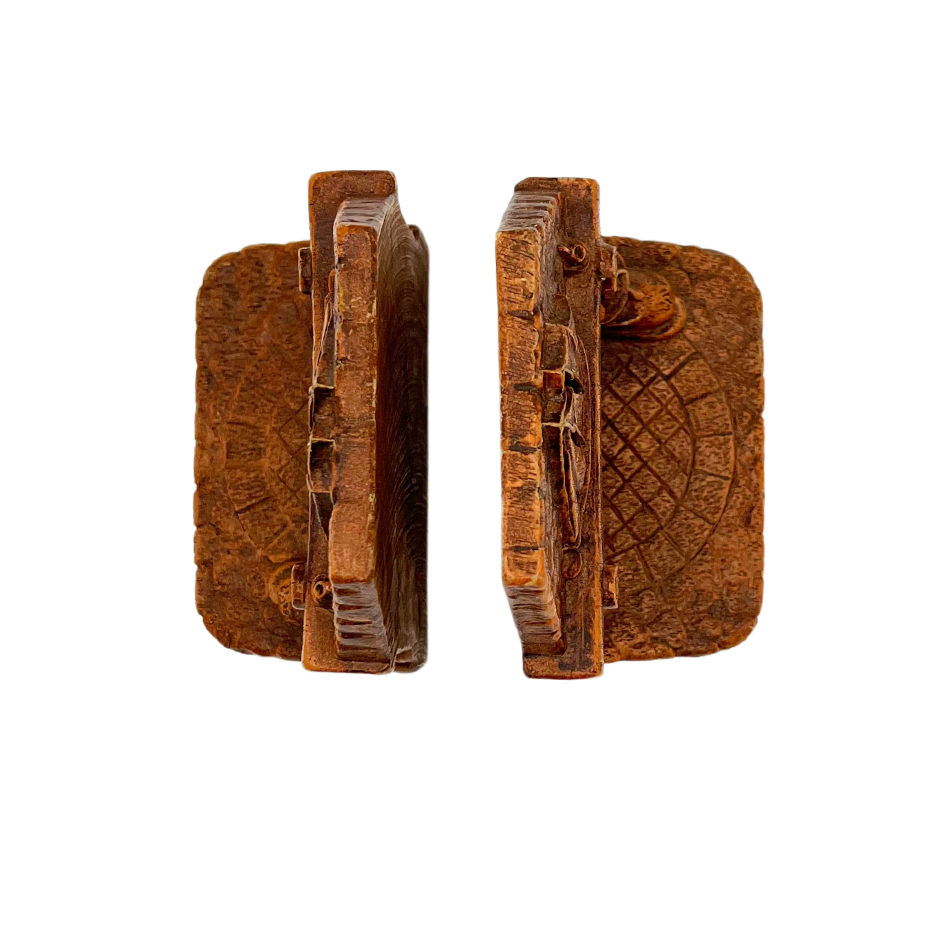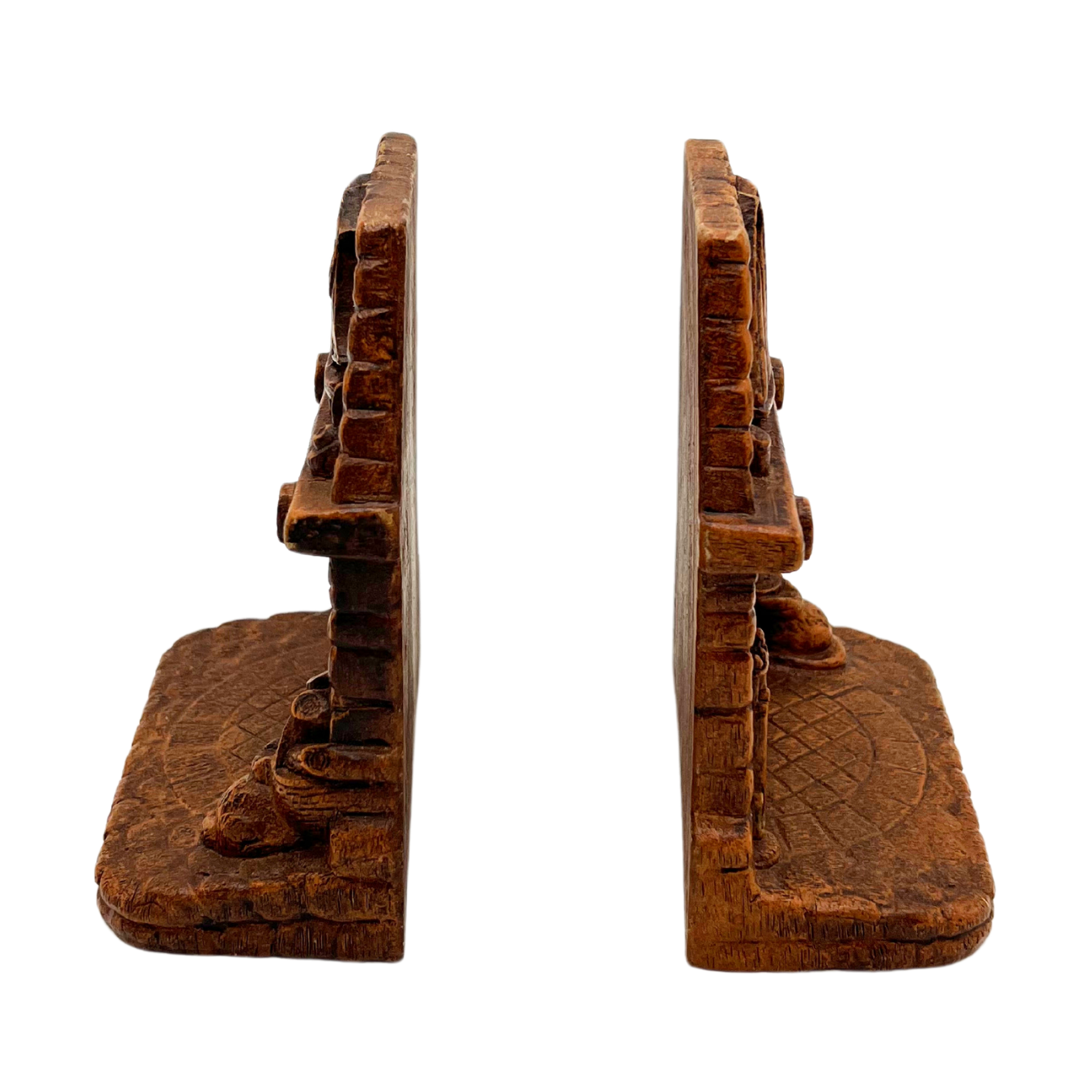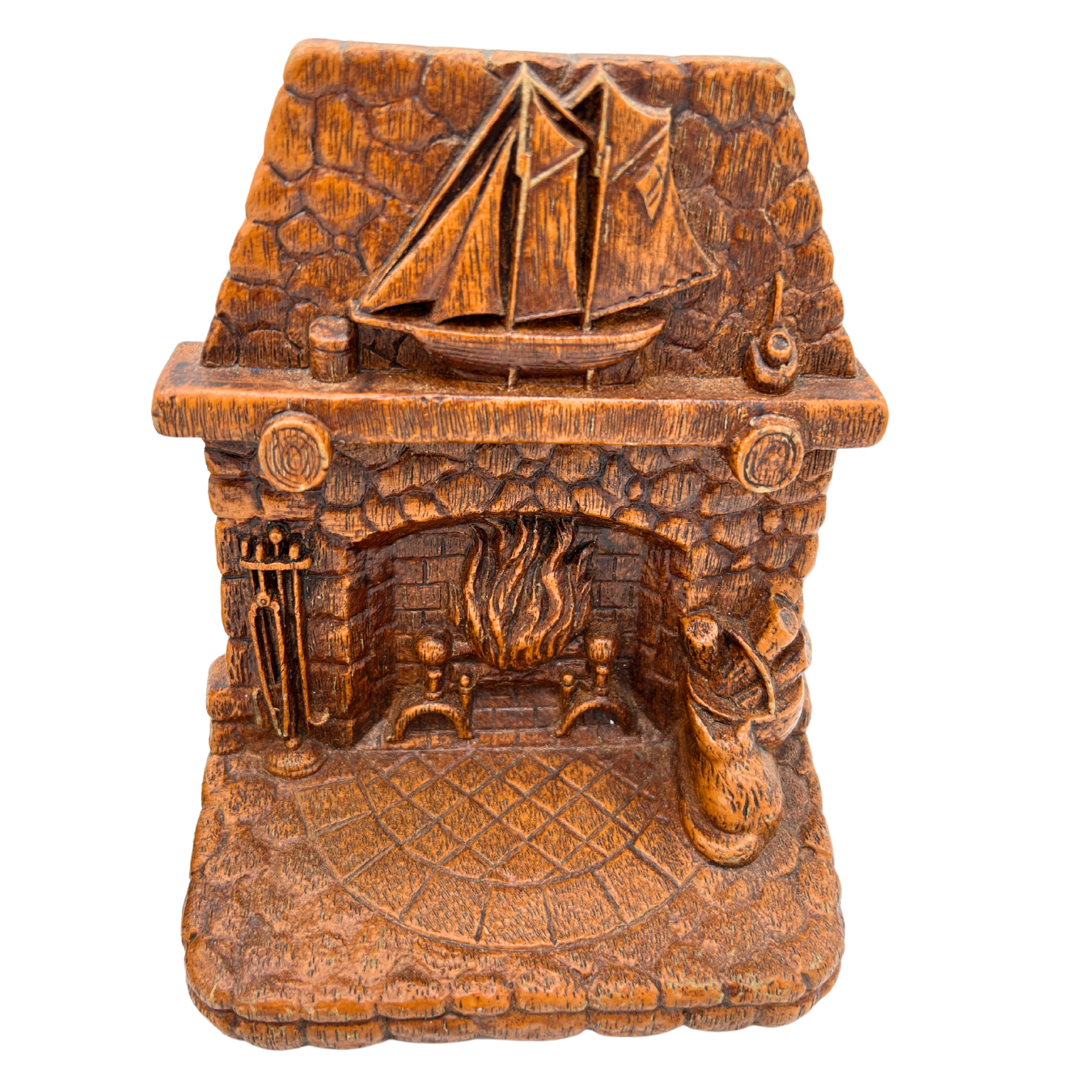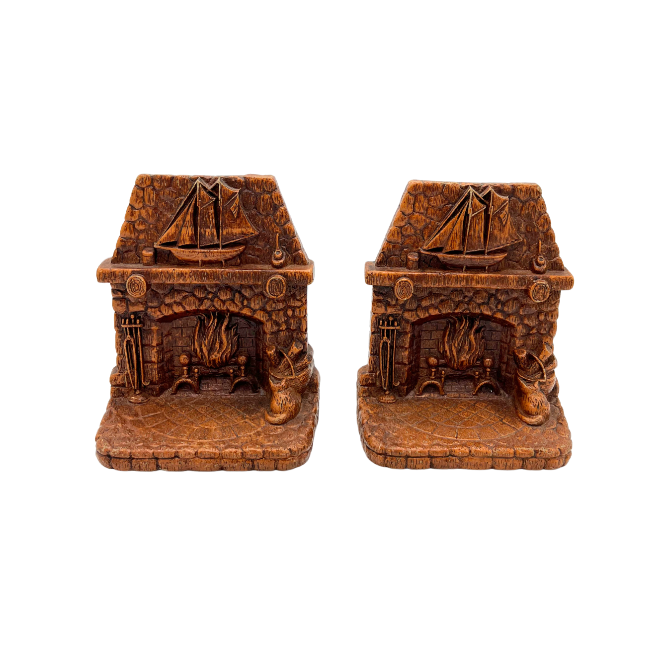 Pair of Syroco faux wood bookends with a nautical fireplace scene. Mid-century. Good vintage condition. Each bookend is 5.75" tall x 5" across.