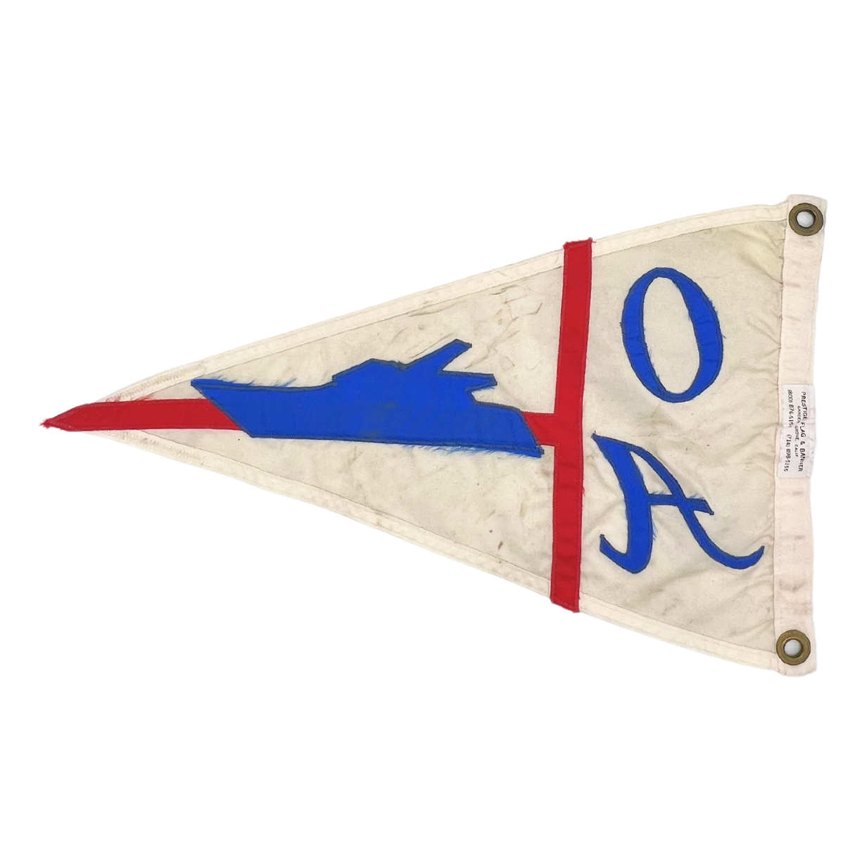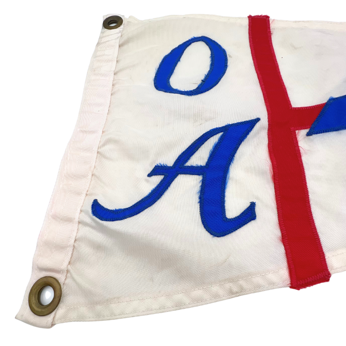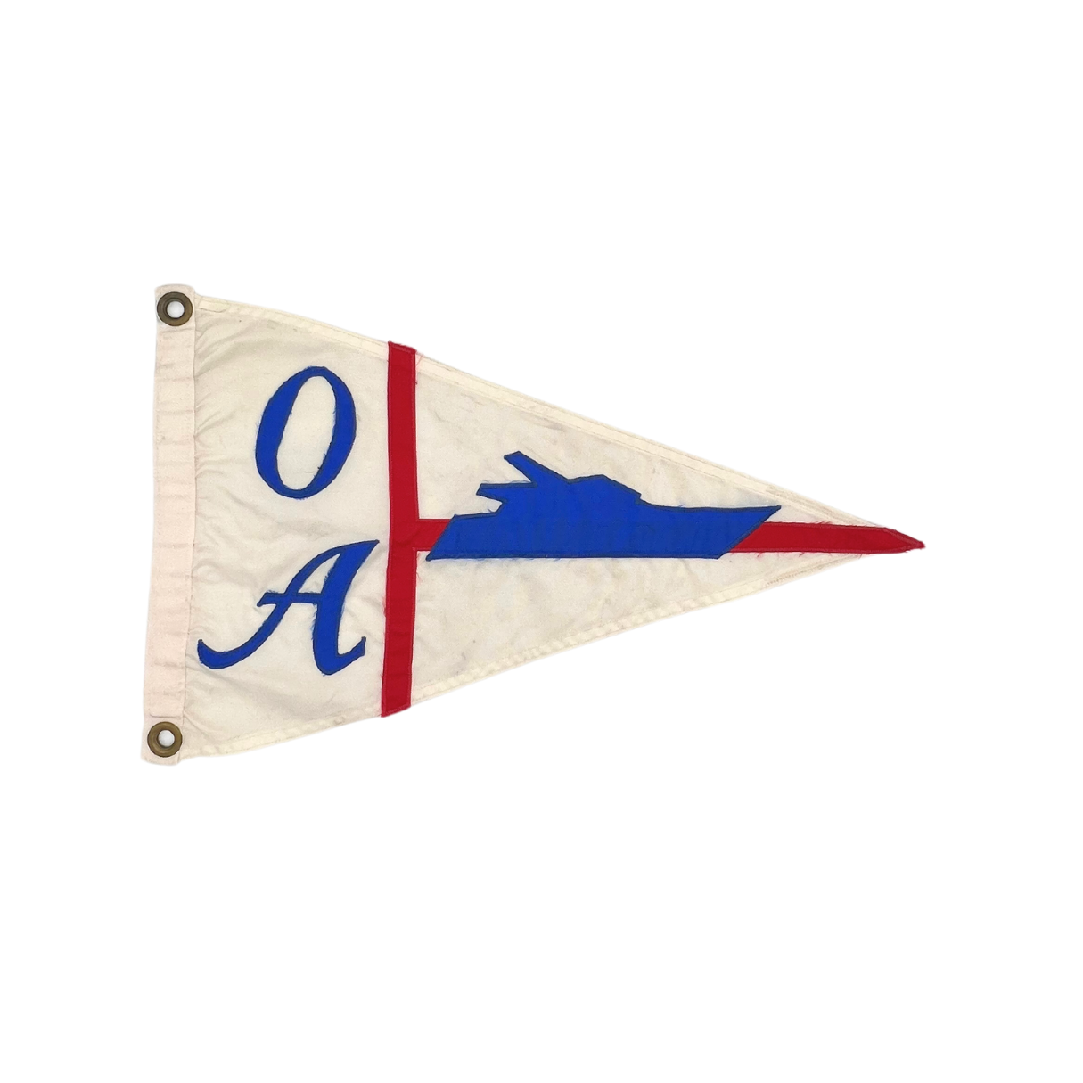 Vintage nylon Ocean Alexander burgee with embroidered motif. Brass rivets with slight patina. Light weathering but overall good vintage condition with vibrant colors. Approximately 20" long.