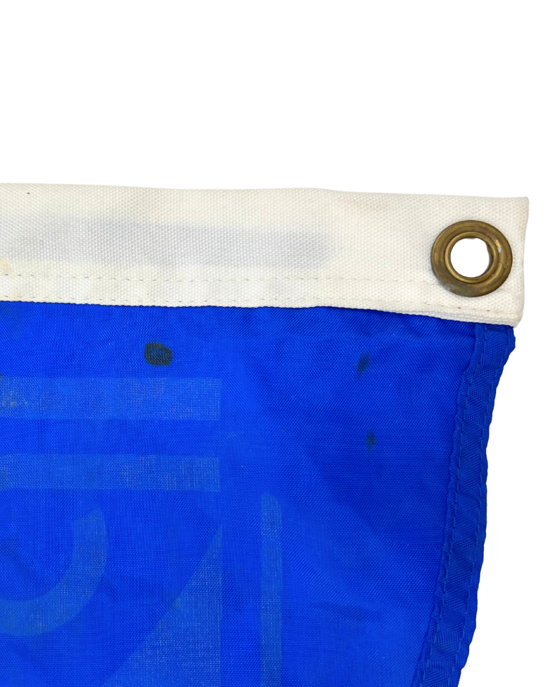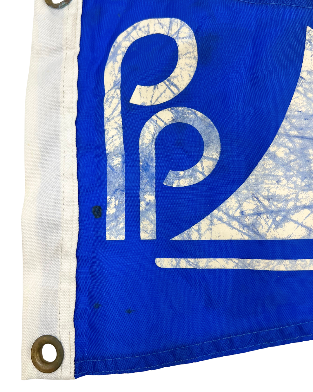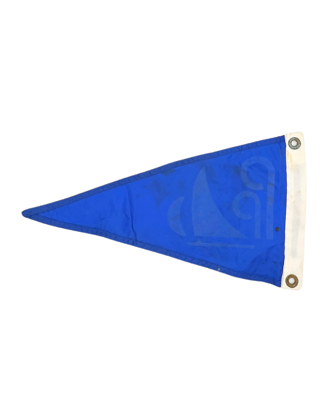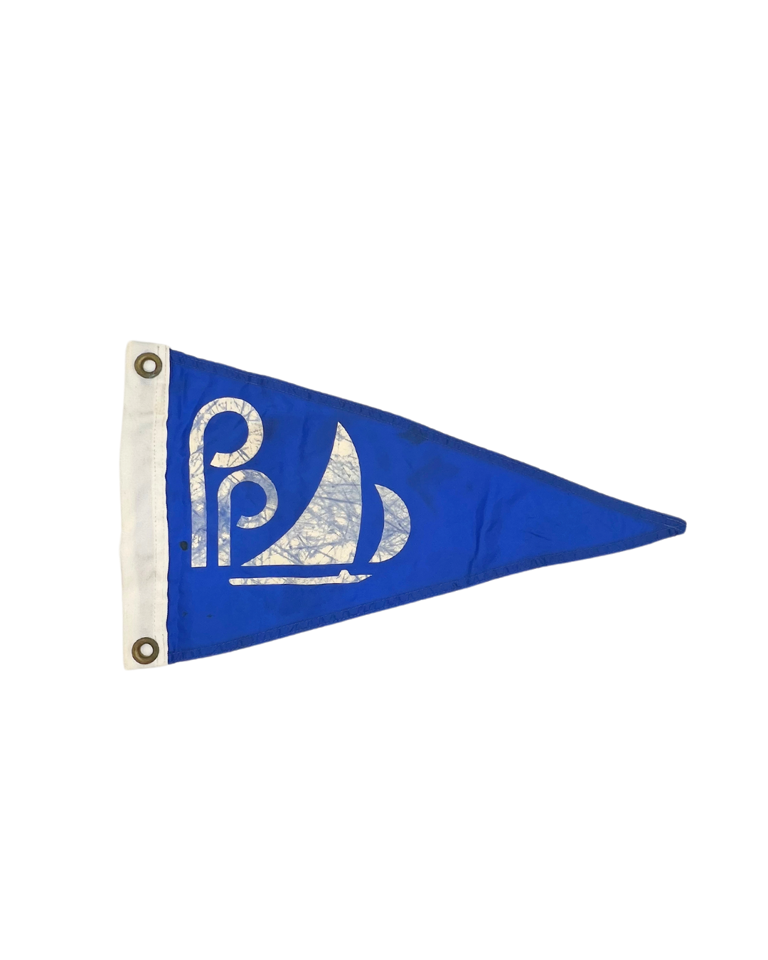 Vintage Percy Preist Yacht Club burgee (out of Nashville, TN). Brass rivets with patina. Nicely weathered - flag motif is faded and there is wear/spots consistent with age. Measures 19.5" long.