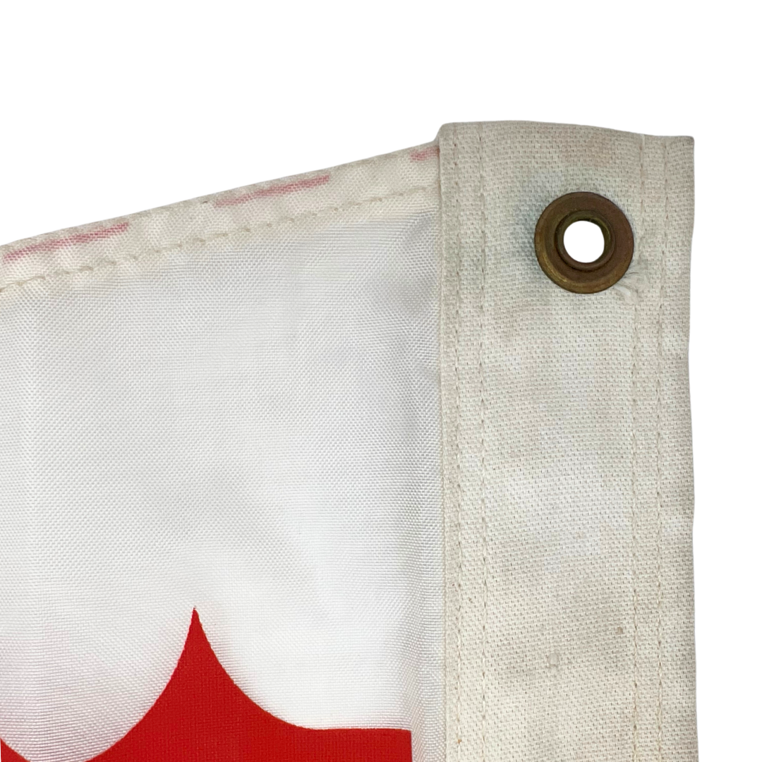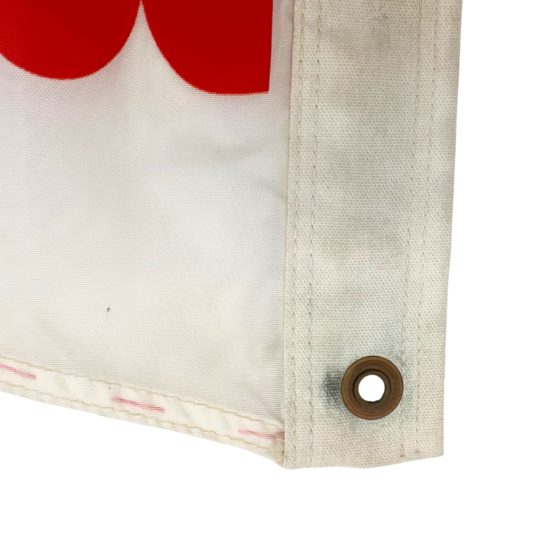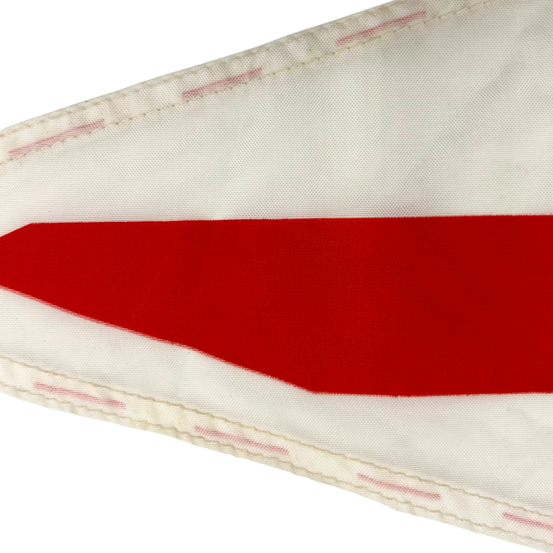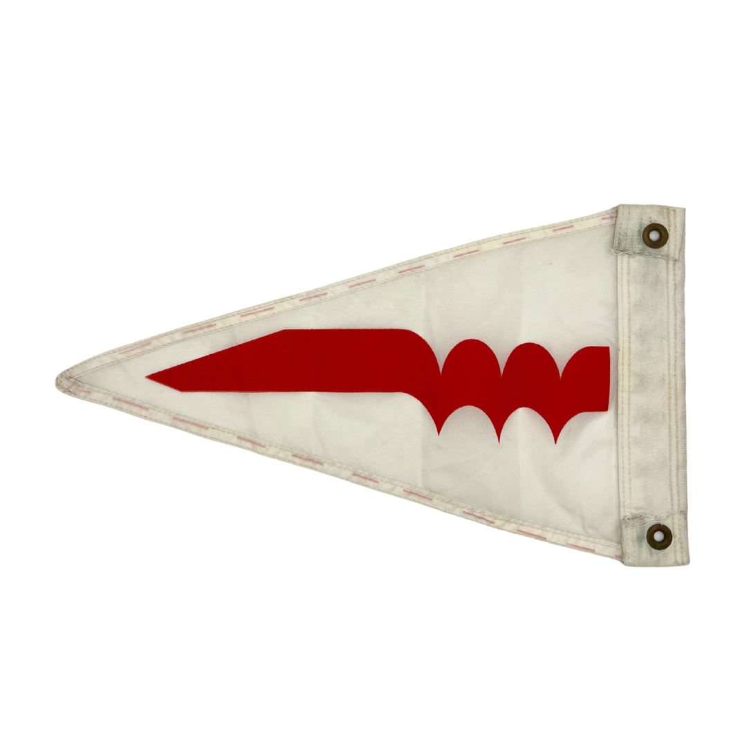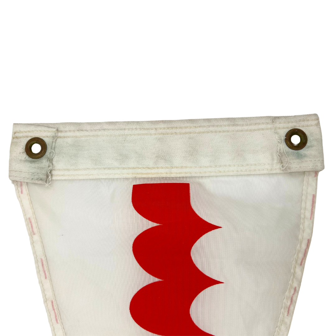 Vintage nylon burgee with red and white pattern. Association unknown. Some weathering with patina on rivets. Approximately 17.5" wide.