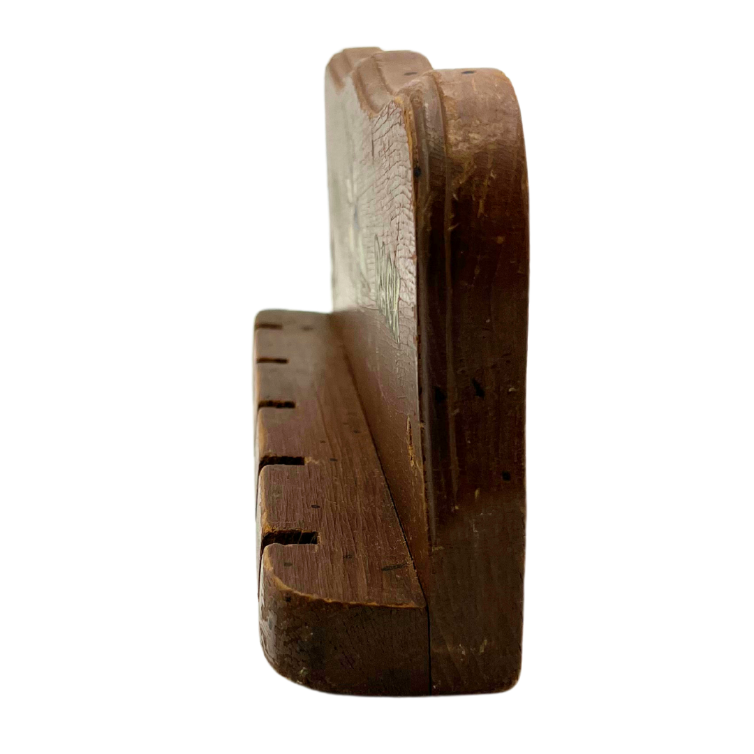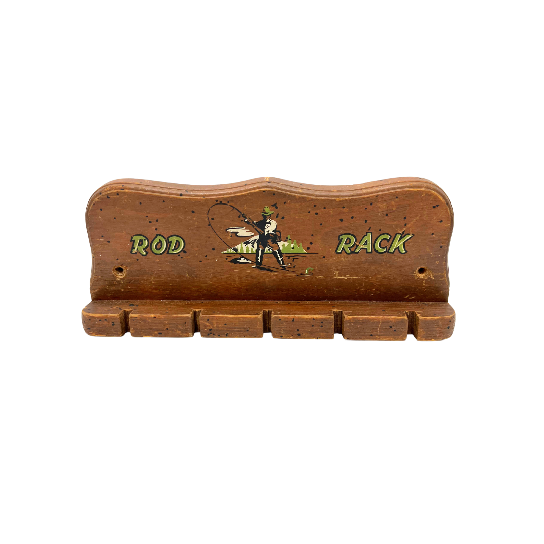 Vintage wooden wall mounted rack for holding fishing poles (fly rods). Handmade in Maine. Estimated 1970s-1980s. Some scuffs and scratches - wear consistent with use and age. Charming piece of cabin decor. Measures 11.75" wide.