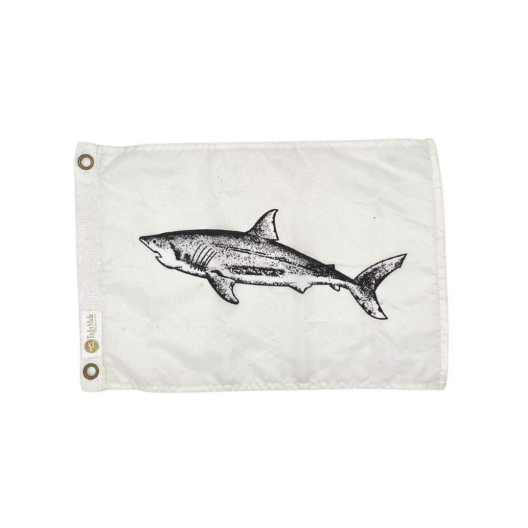 Vintage shark fishing flag from Taylor Made. Brass rivets with slight patina. Some marks/discoloration consistent with age but overall good vintage condition. Approximately 18" x 12".