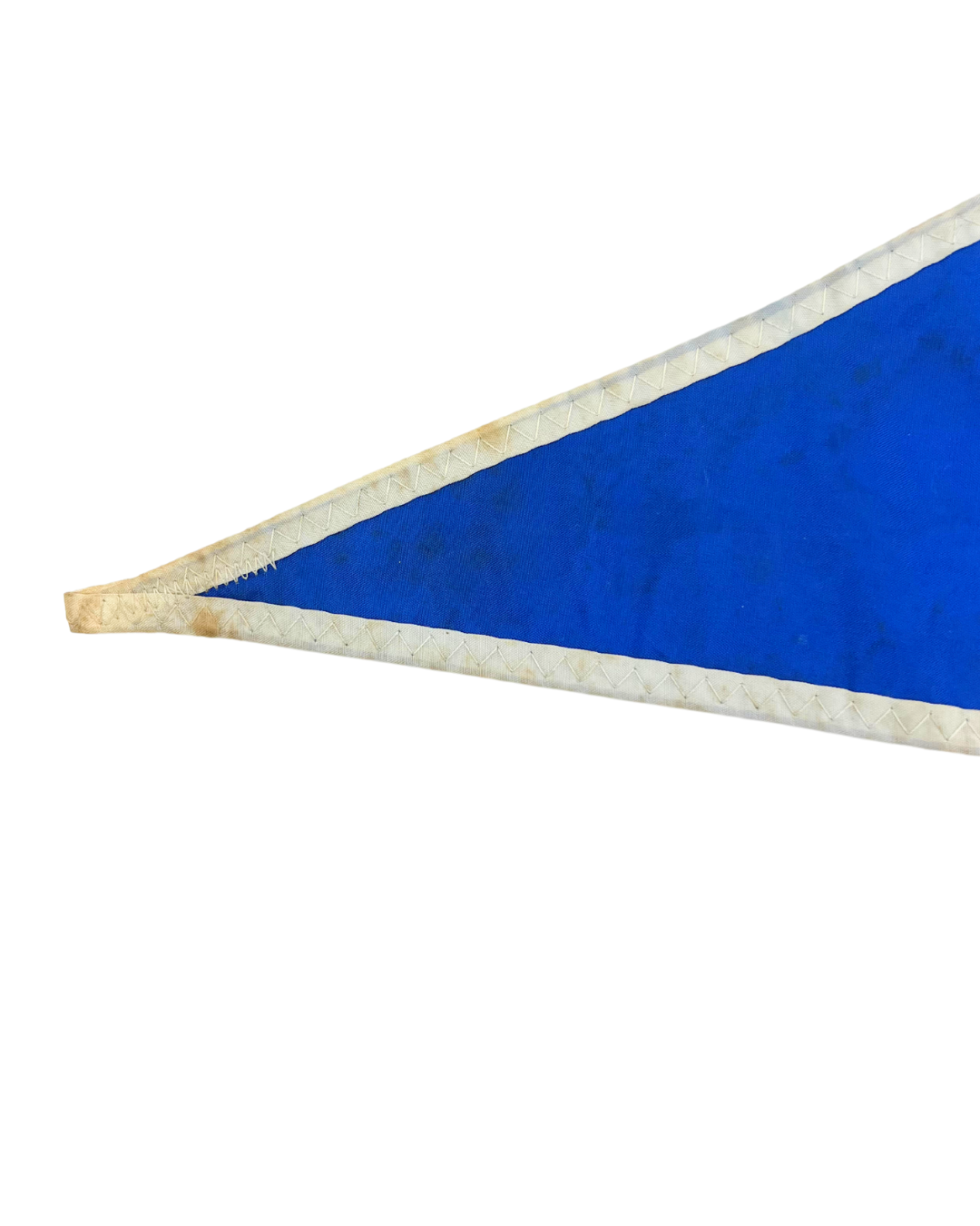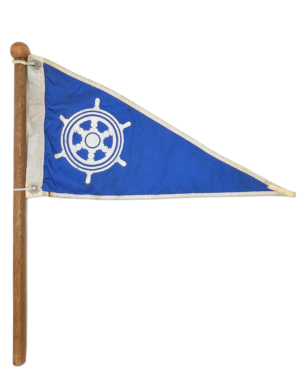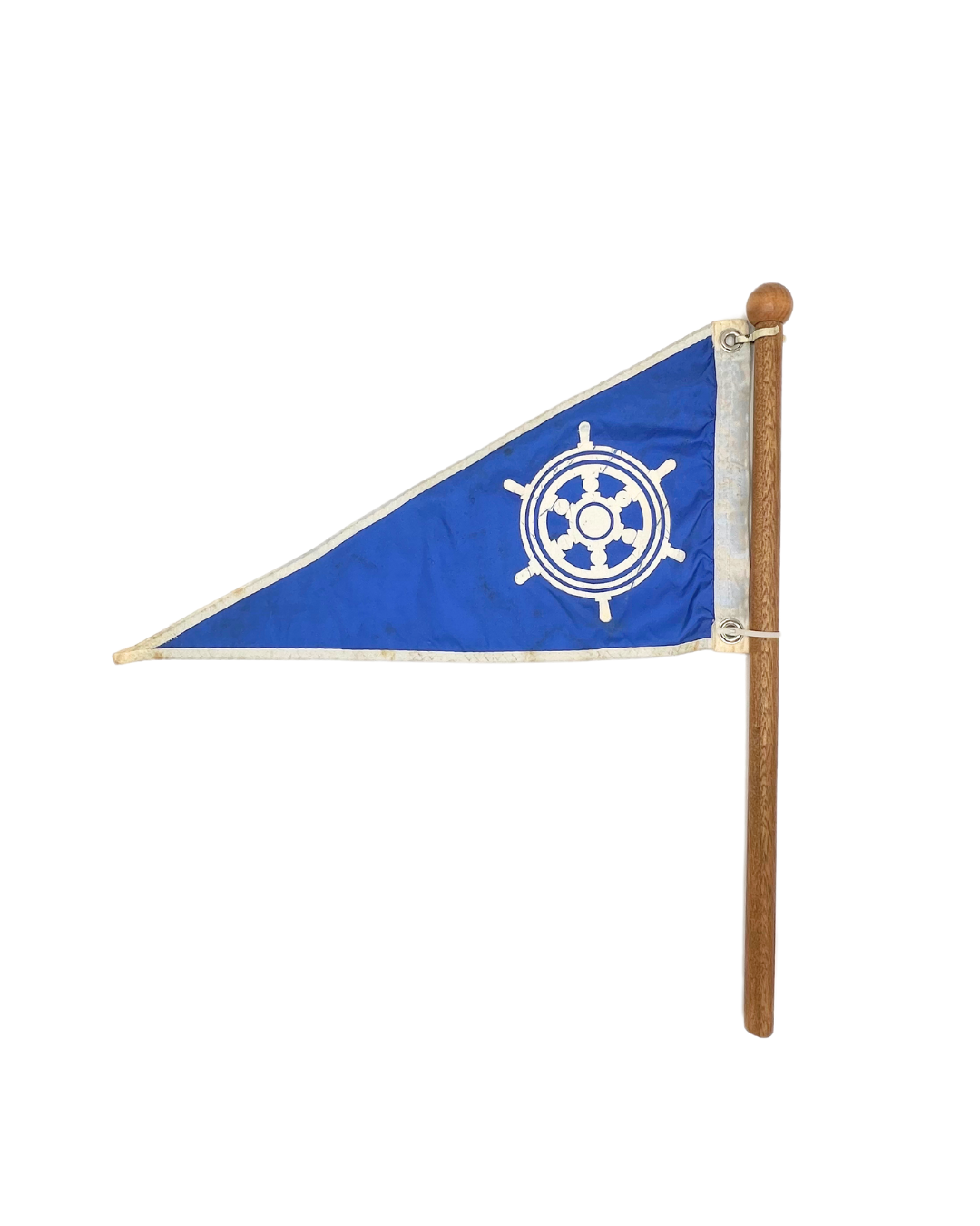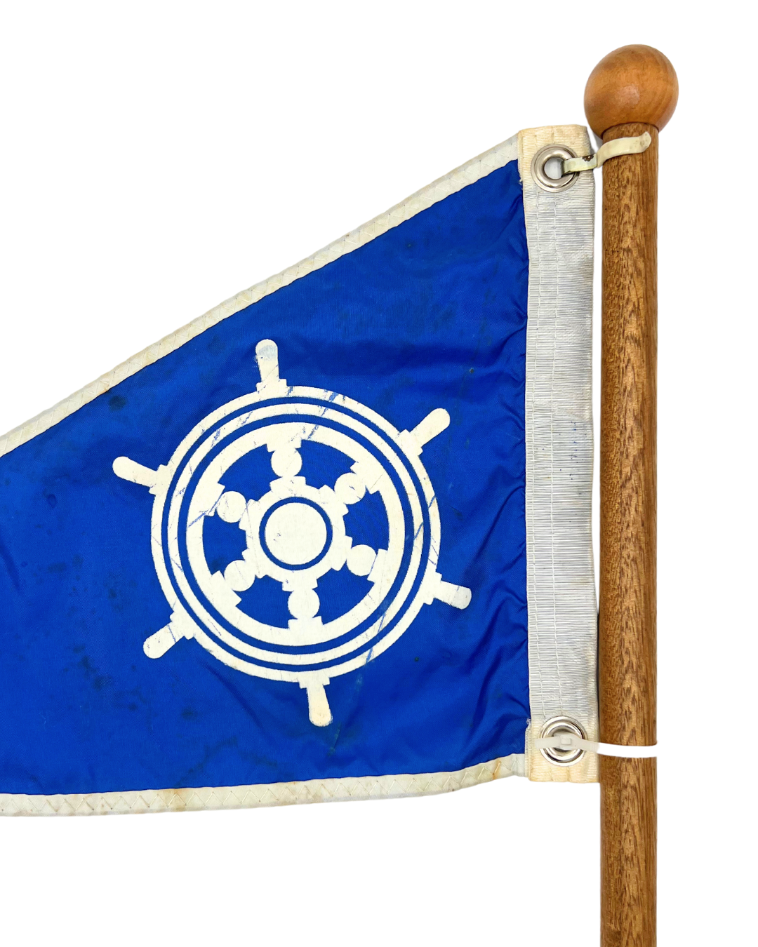 Vintage nylon burgee with a ships wheel motif affixed to a short wooden pole. Slight weathering, overall good vintage condition. Flag + pole measure approximately 19.25" tall x 17.5" wide; flag only is 9.25" tall x 16.5" wide.