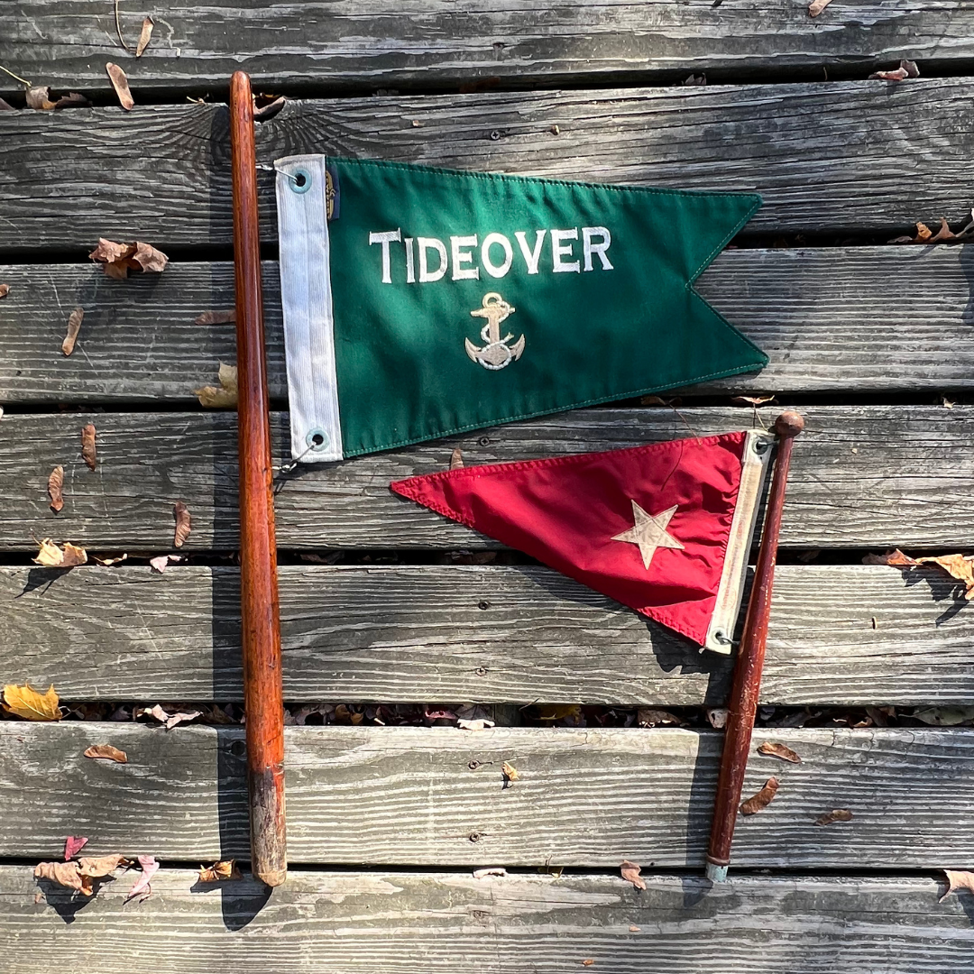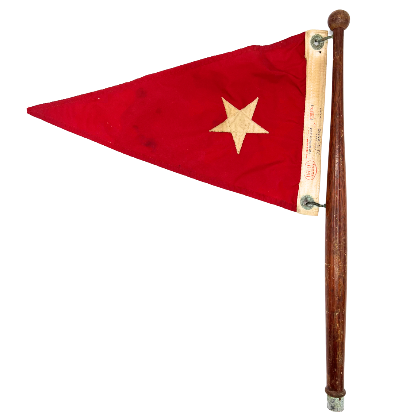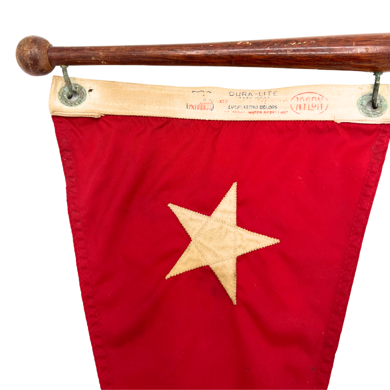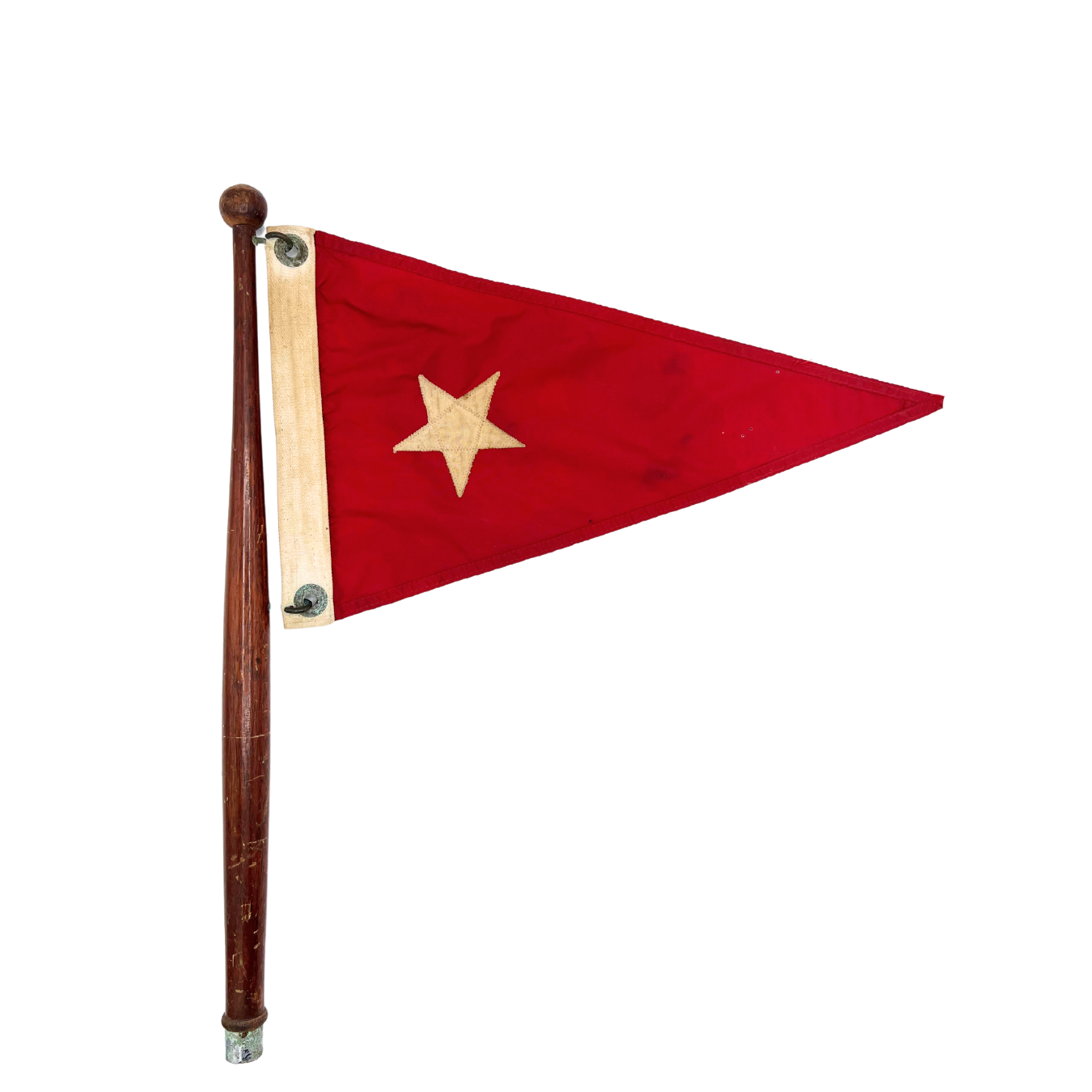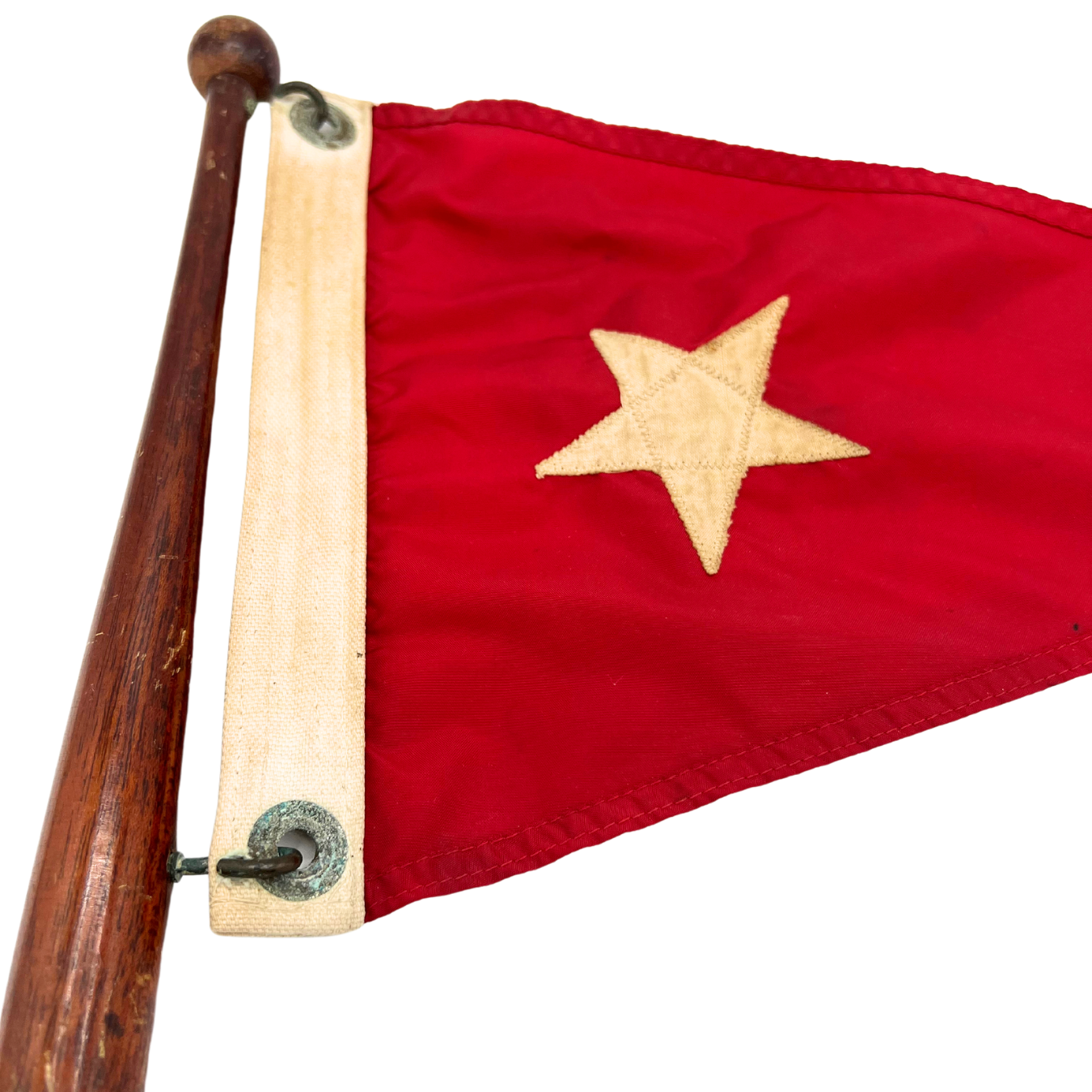 Vintage yacht club burgee affixed to a teak pole. Burgee is associated with the original Brooklyn yacht club. Nylon burgee with cotton details. Nice character/weathering, heavy patina on the rivets. Estimated mid-century. Rare find. Flag pole is 18" long and flag measures 14" wide (flag + pole together are approximately 15" wide).