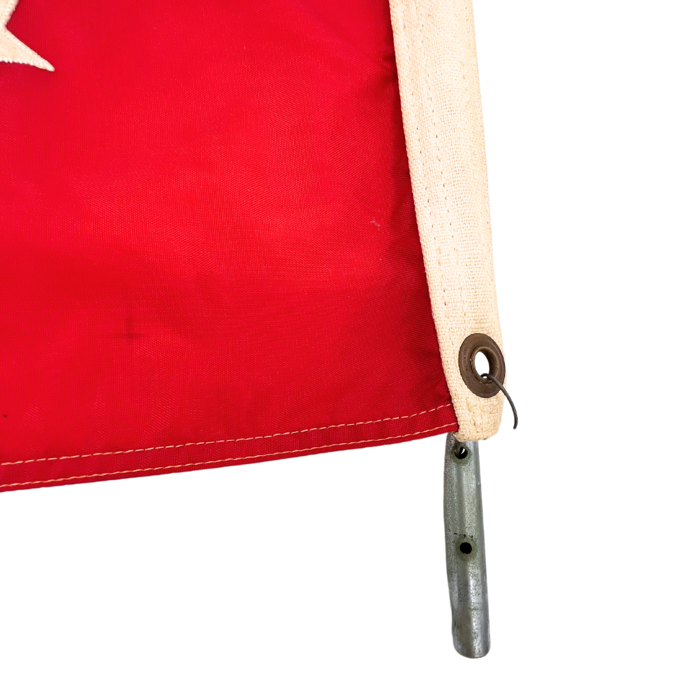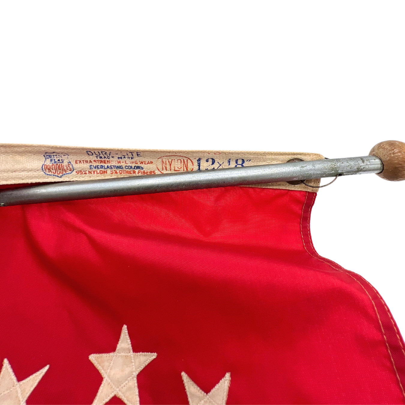Vintage Vice Commodore flag. Nylon flag with stitched emblem. Flag is attached to a metal pole with a wooden topper. Cotton edging with nice patina on rivets. Rare find. Flag is approximately 19" x 12" and pole is 16" tall.