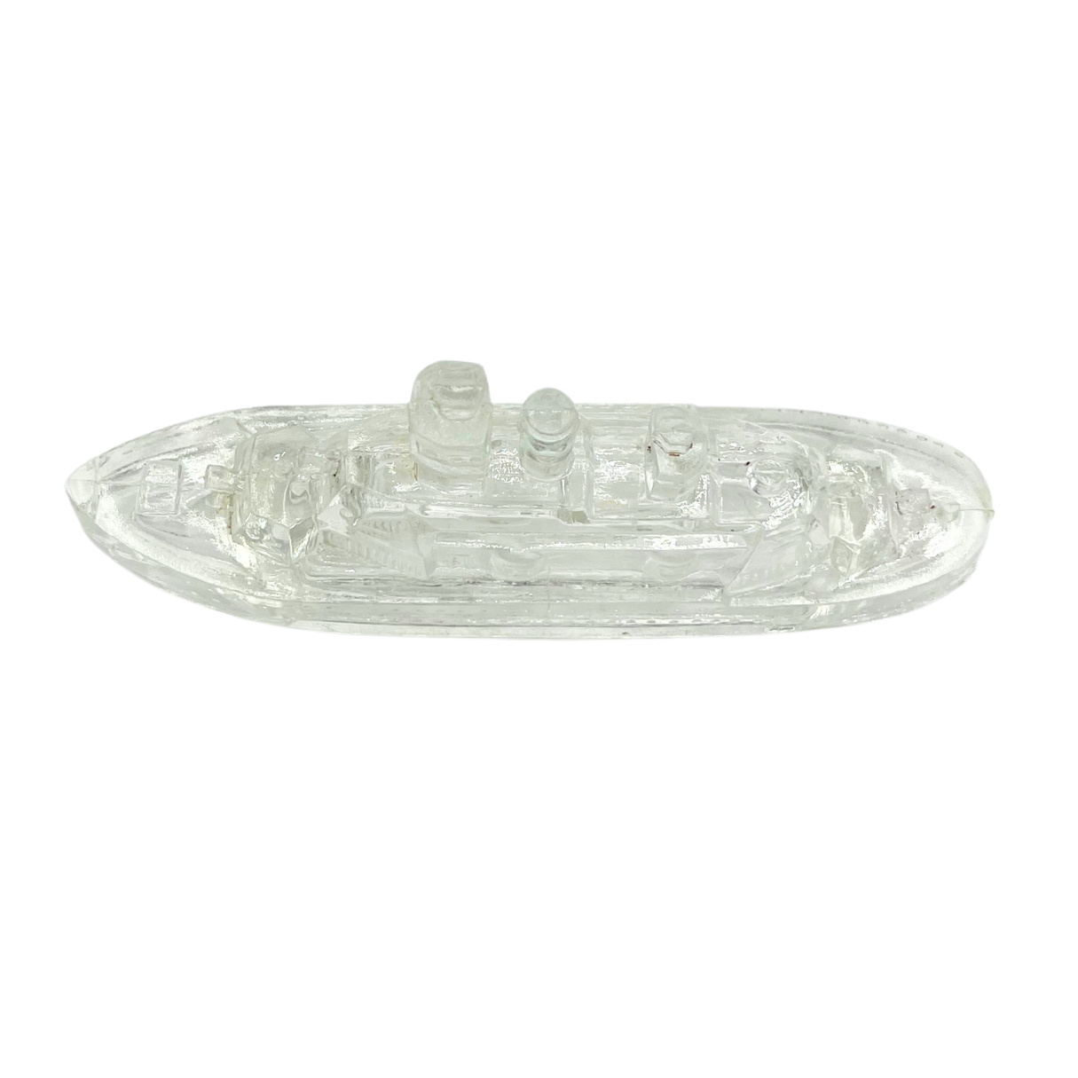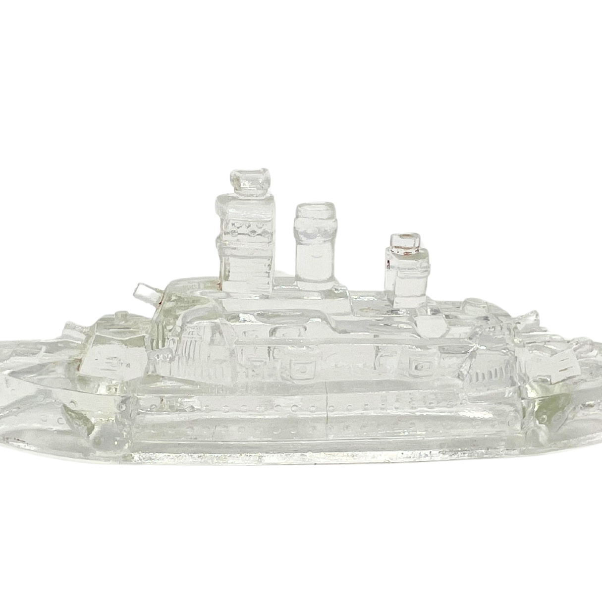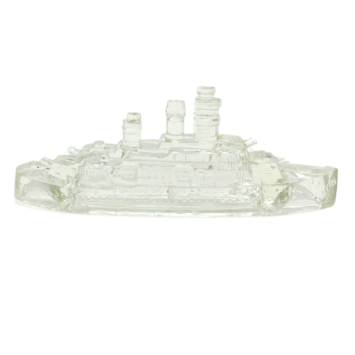 Victory Glass Co. battleship shaped candy dish c1930s. The glass ship was sold with paper on the bottom and the candy was inside. No flaws observed. Approximately 5.5" long.