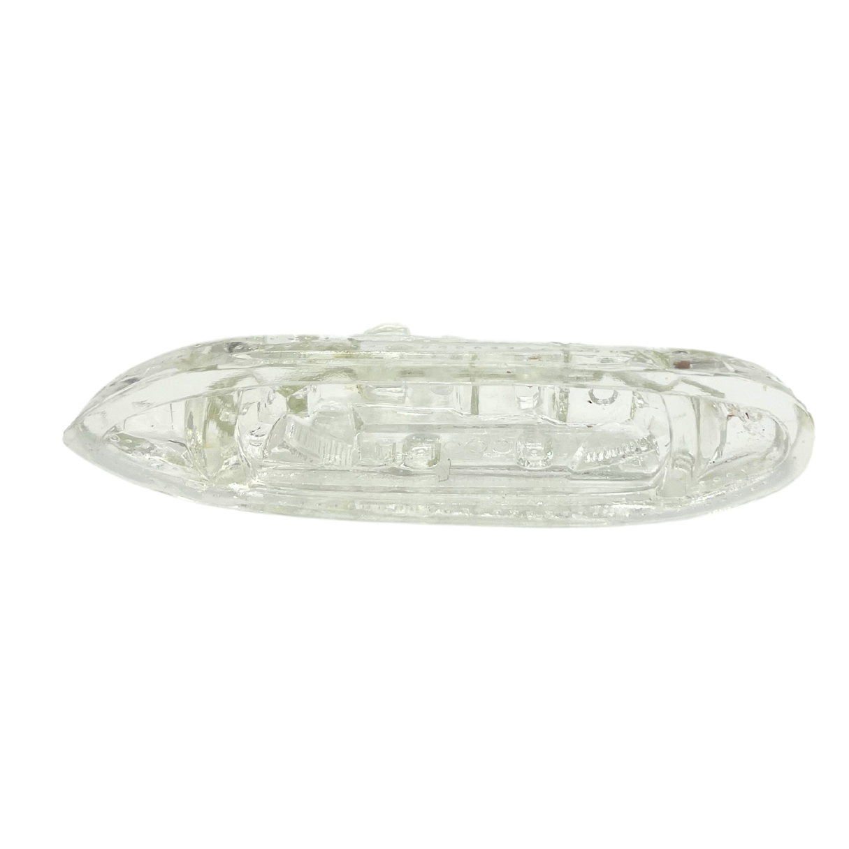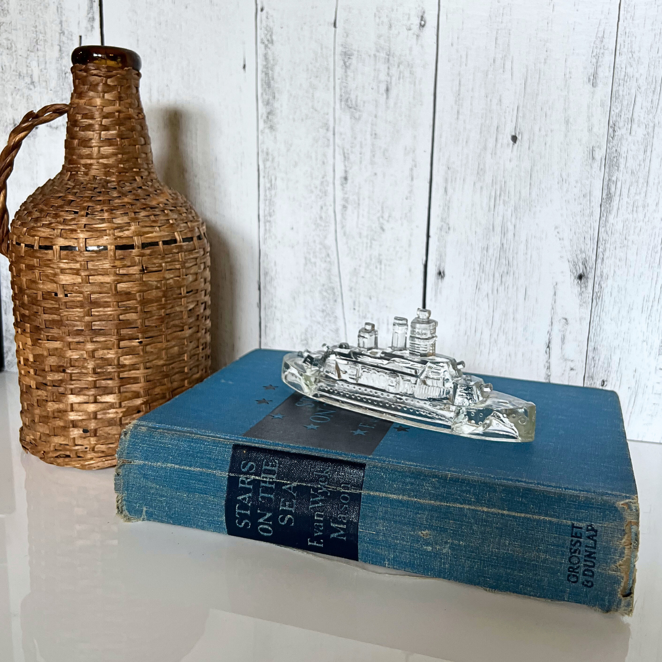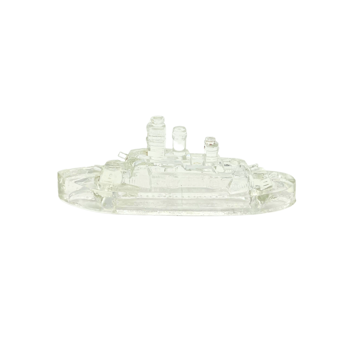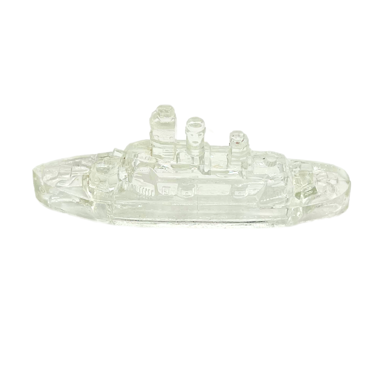Victory Glass Co. battleship shaped candy dish c1930s. The glass ship was sold with paper on the bottom and the candy was inside. No flaws observed. Approximately 5.5" long.