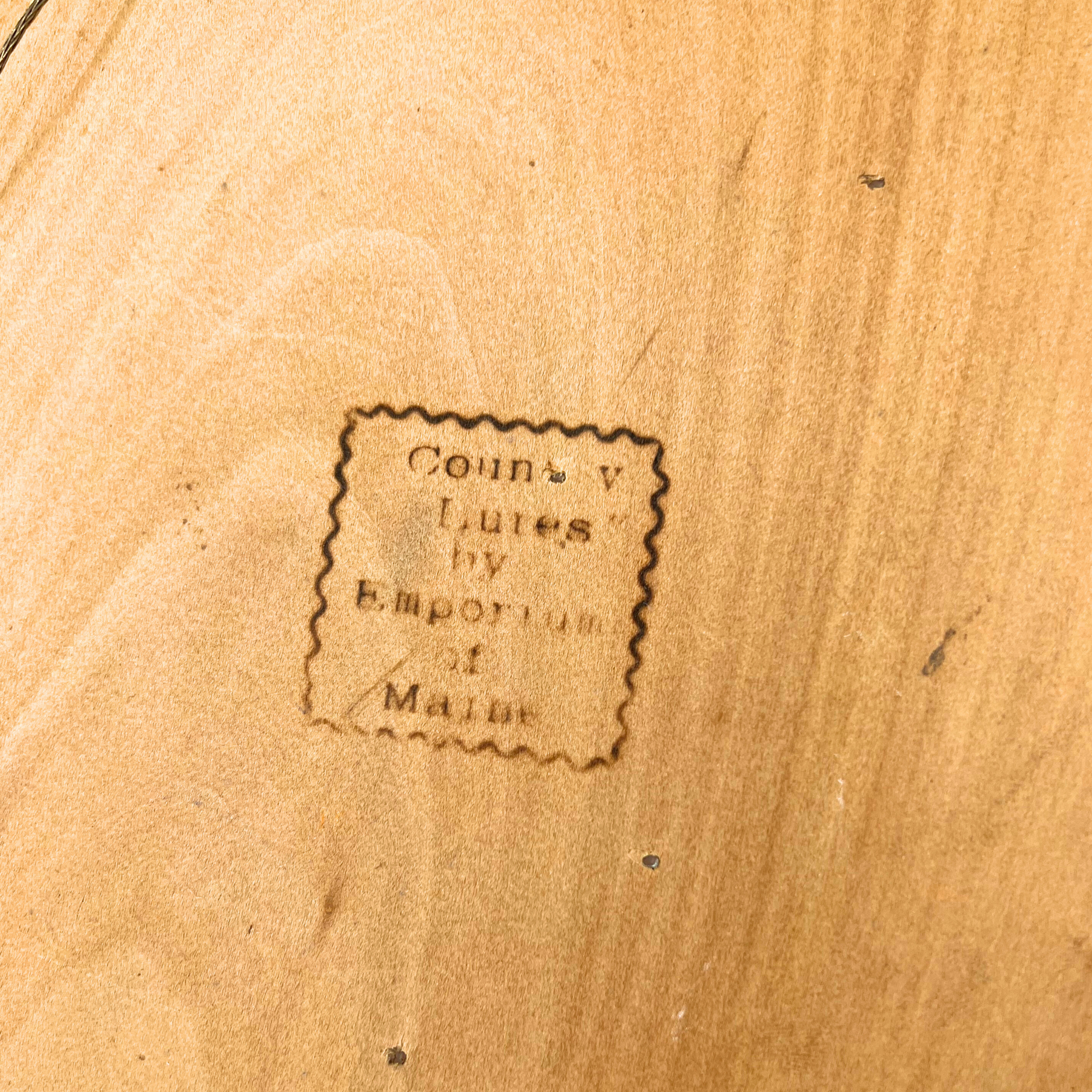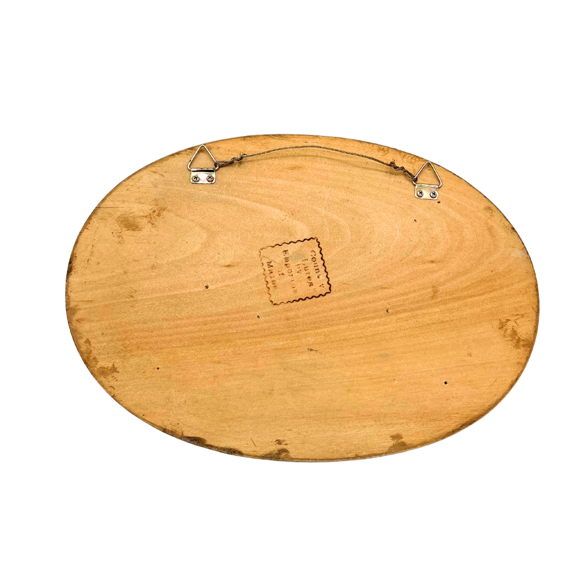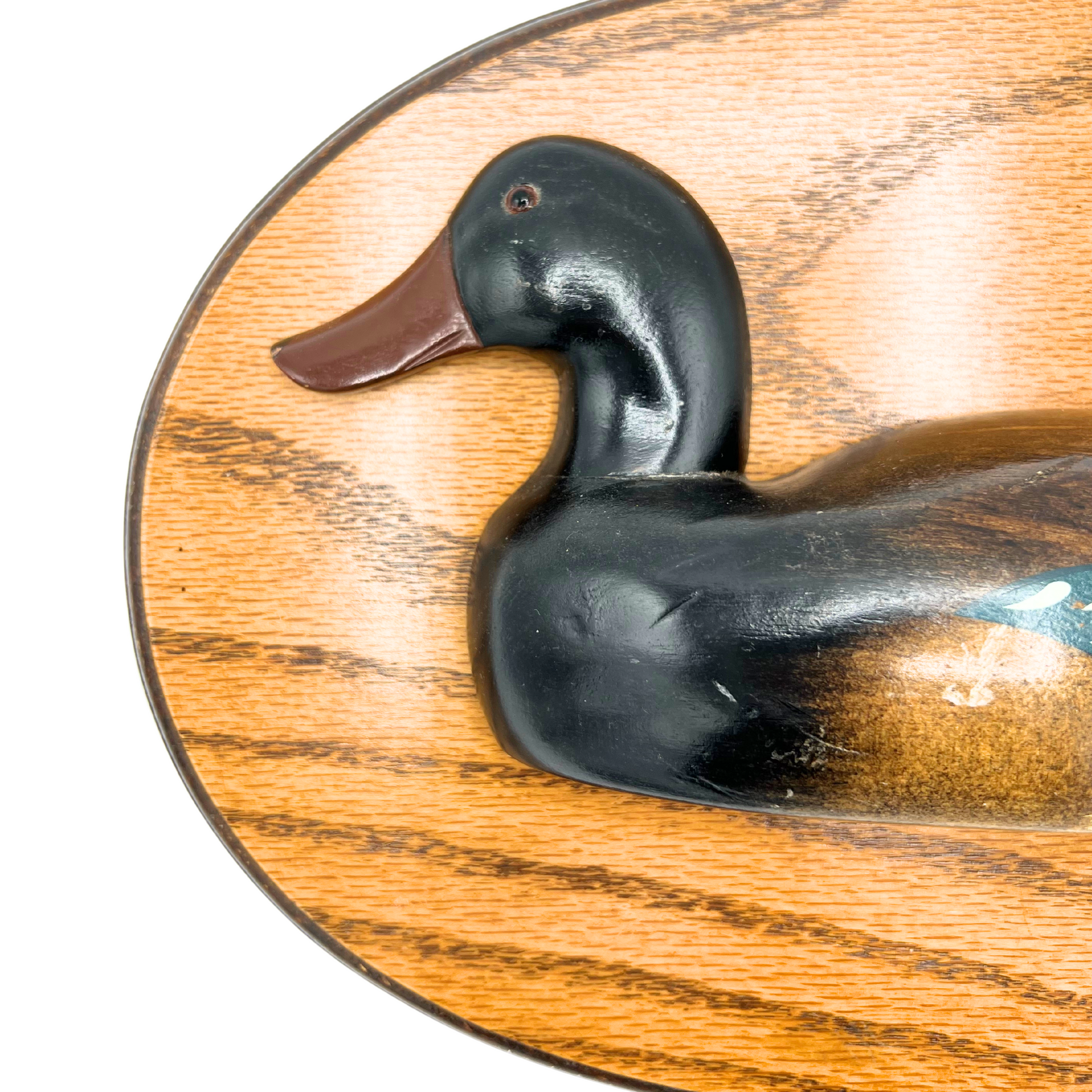 Vintage wooden half duck decoy mounted on plaque. Mallard duck. Maker stamped on back. Good condition - some small marks, wear consistent with age. 11.75" across.