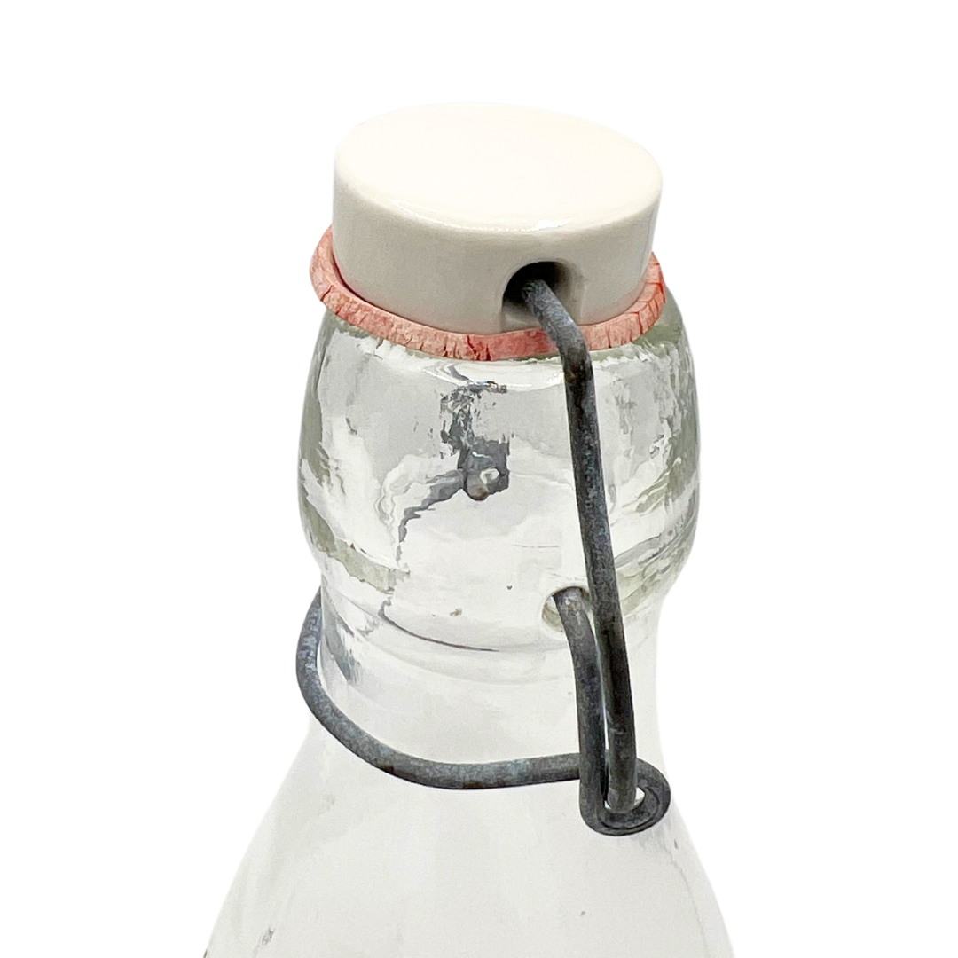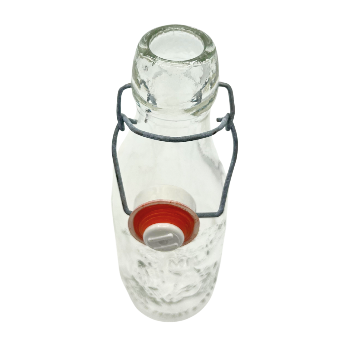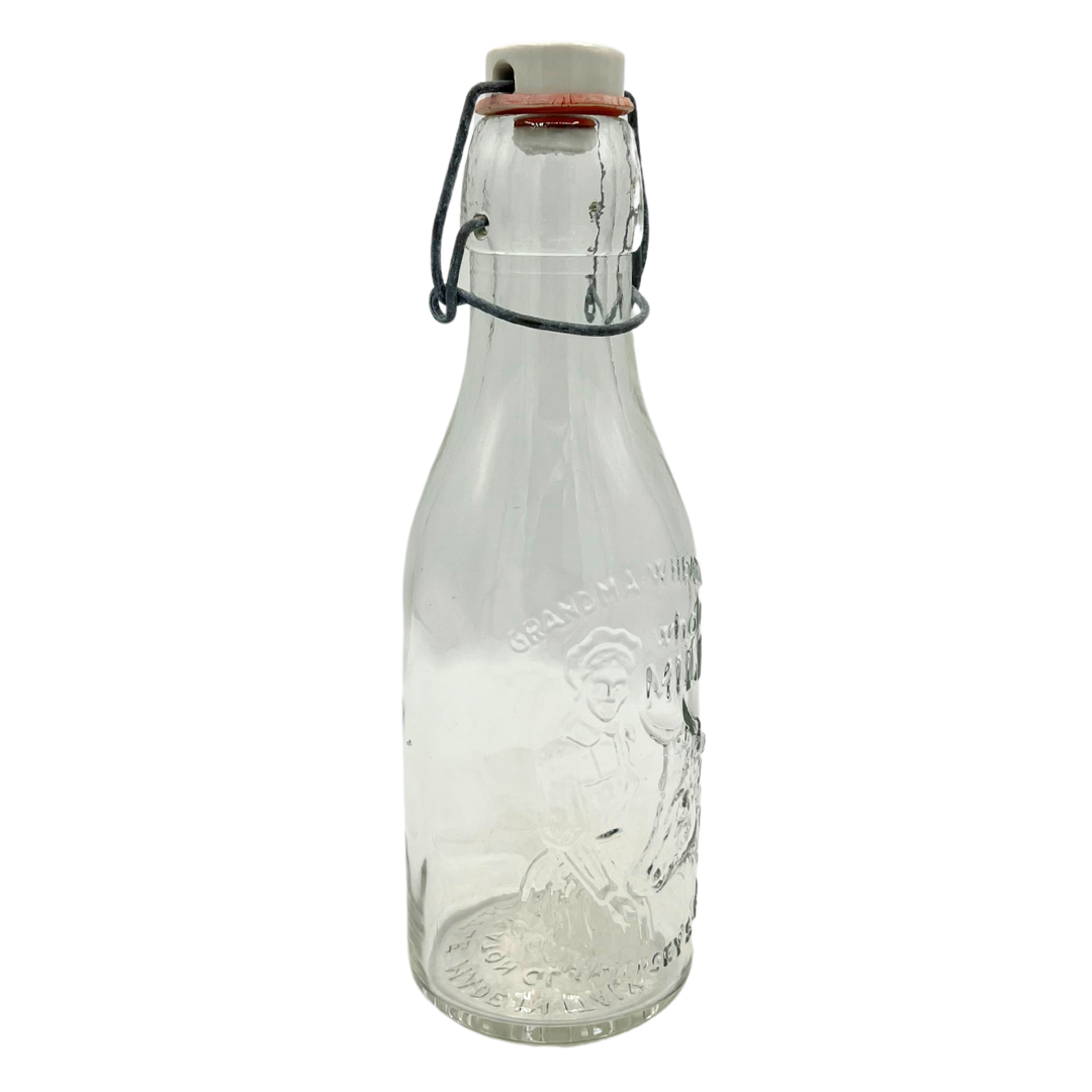 Vintage Grandma Wheaton glass milk bottle with attached glass stopper. Wear consistent with age. Bottle stands 9" tall with stopper.