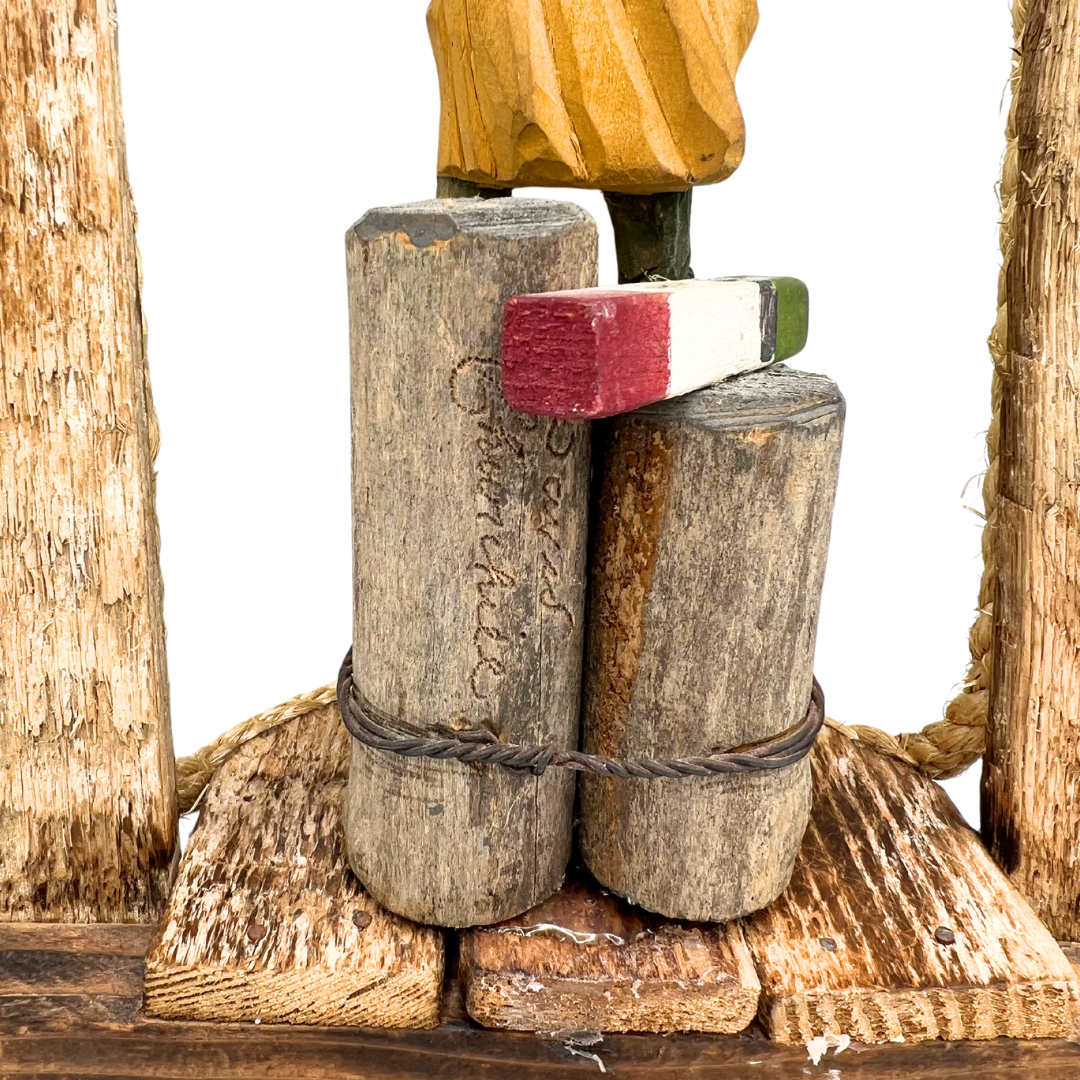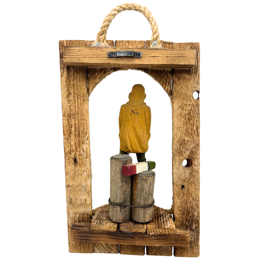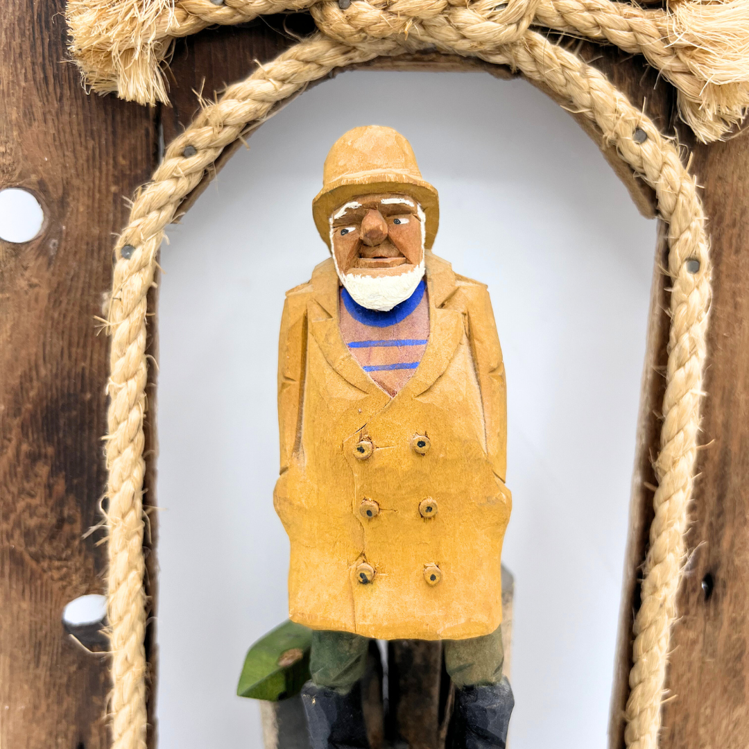Vintage fisherman wall hanging. Hand-carved fisherman figurine centered in a wooden frame. Rope details including a loop for hanging on the wall. Artist signature on back - see photos. Age unknown. Approximately 13.5" tall x 8" wide.