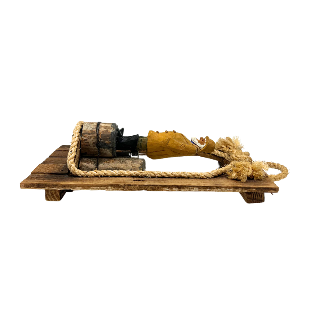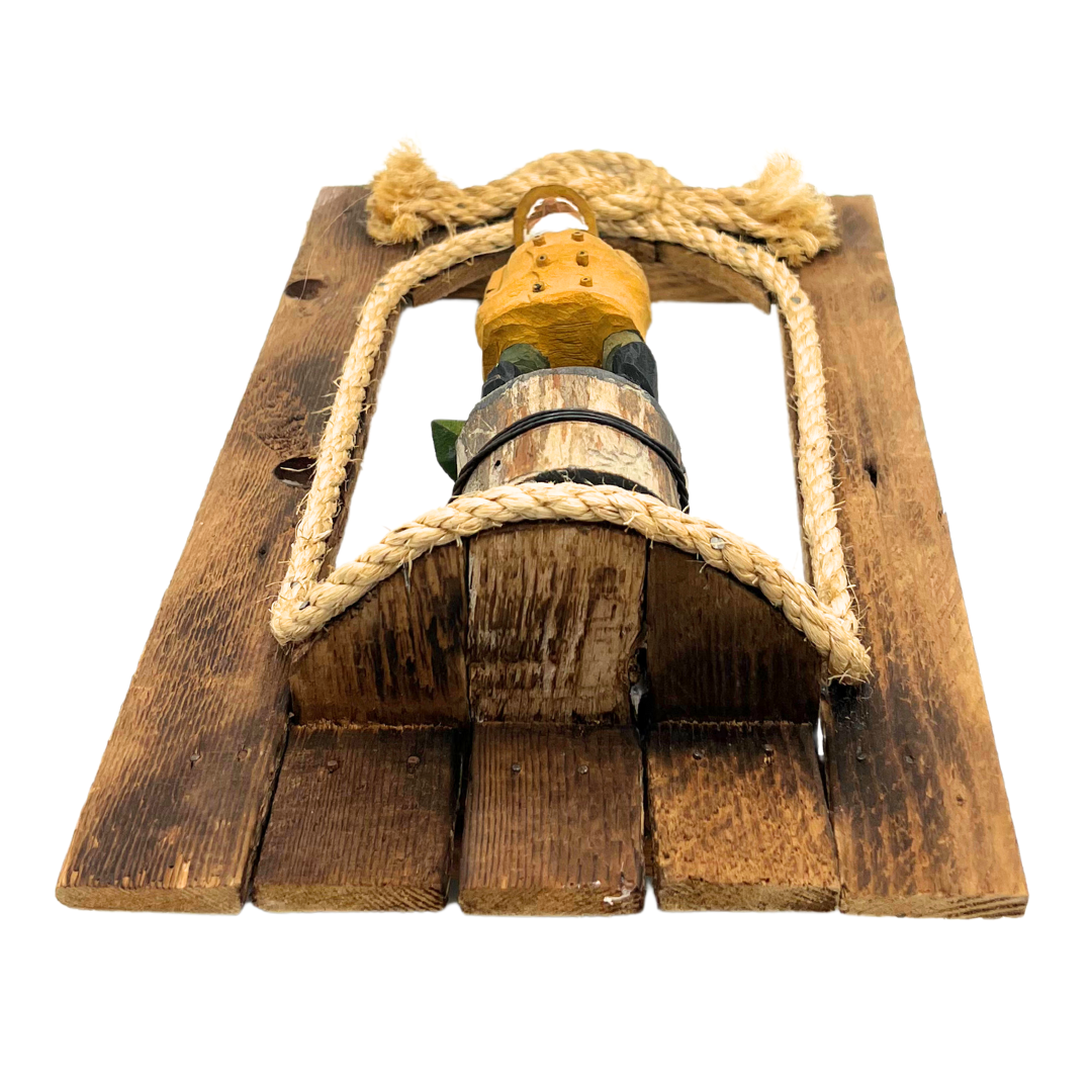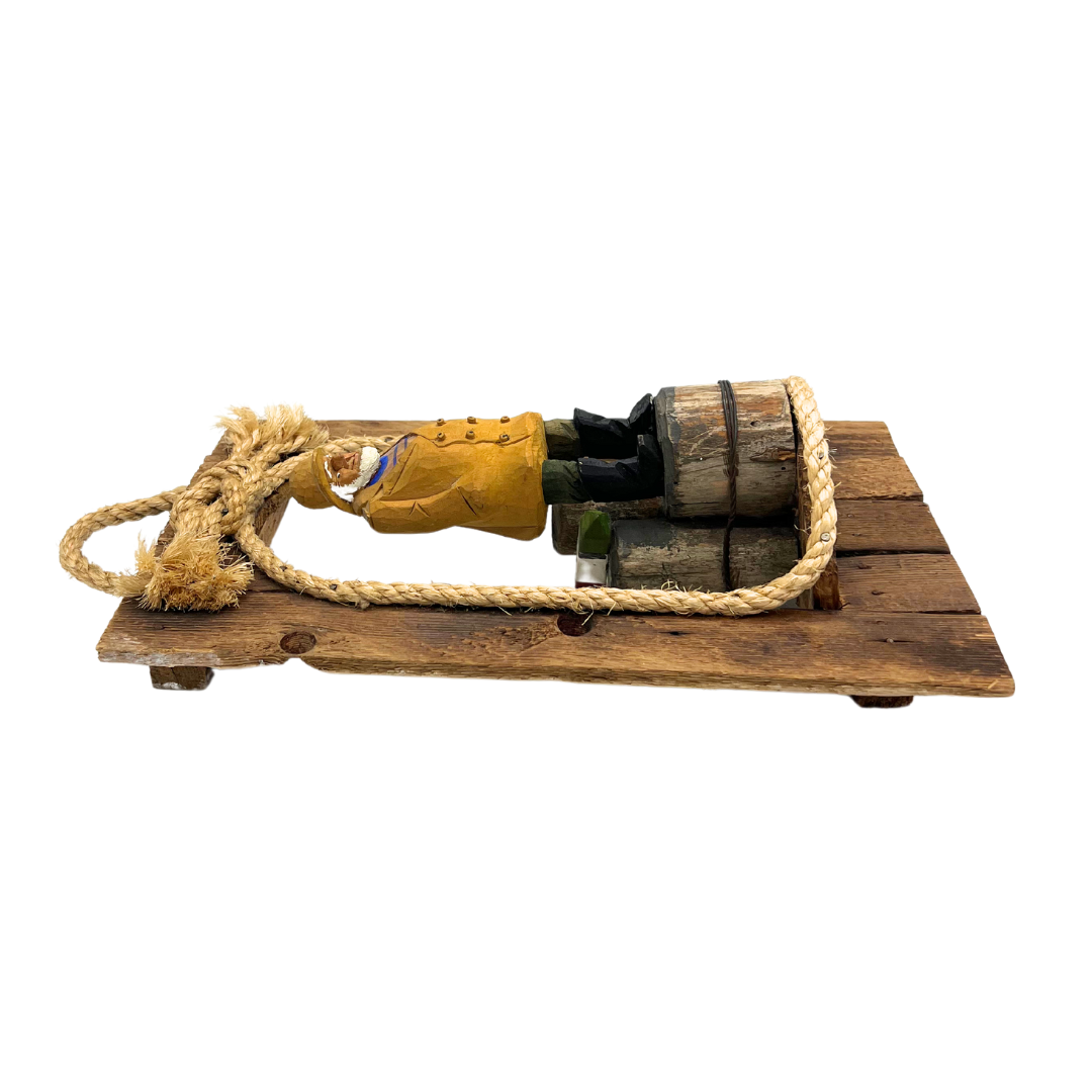 Vintage fisherman wall hanging. Hand-carved fisherman figurine centered in a wooden frame. Rope details including a loop for hanging on the wall. Artist signature on back - see photos. Age unknown. Approximately 13.5" tall x 8" wide.