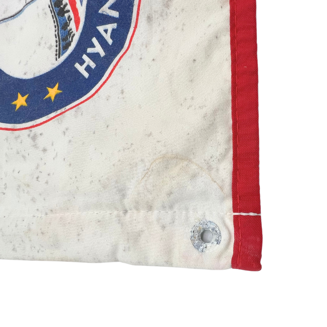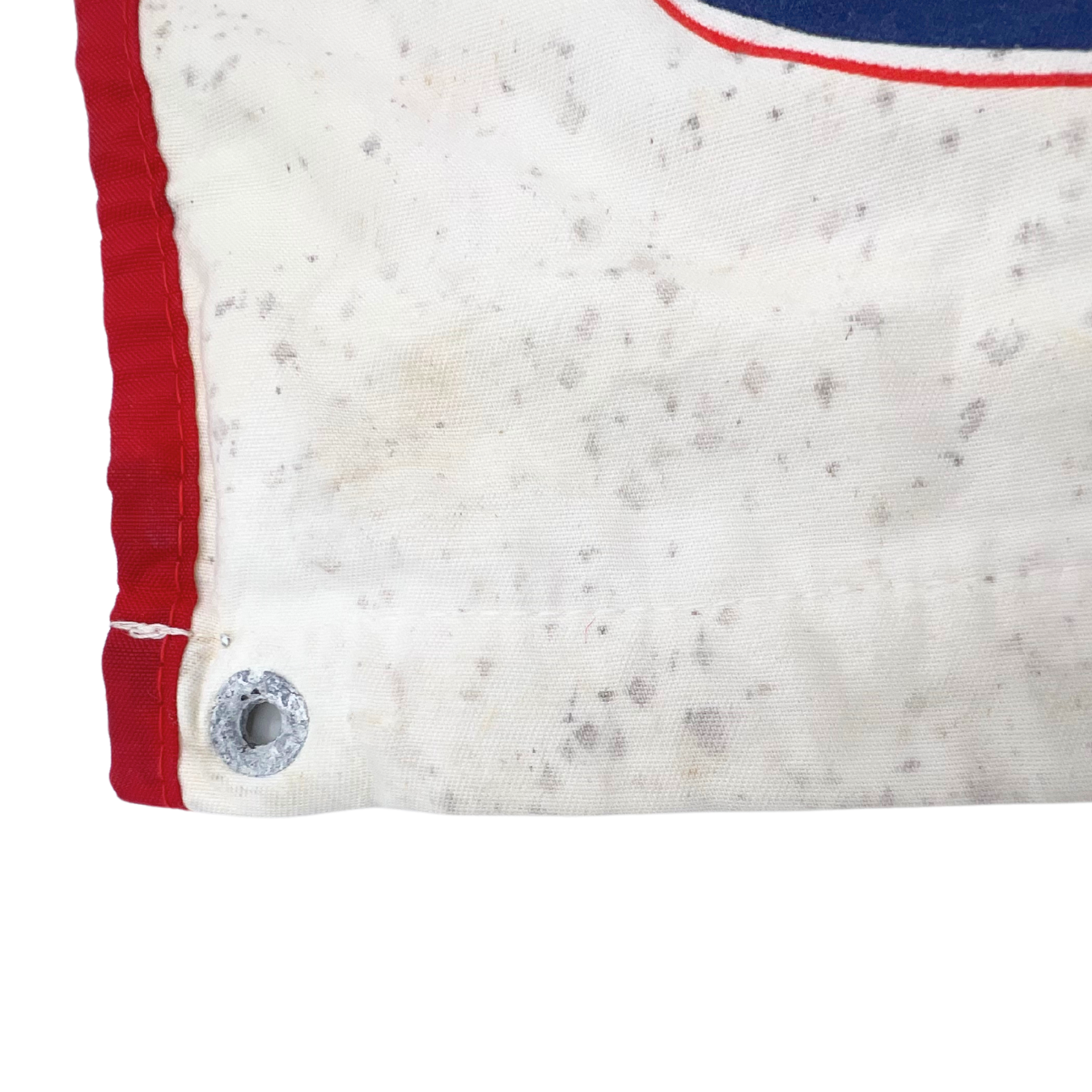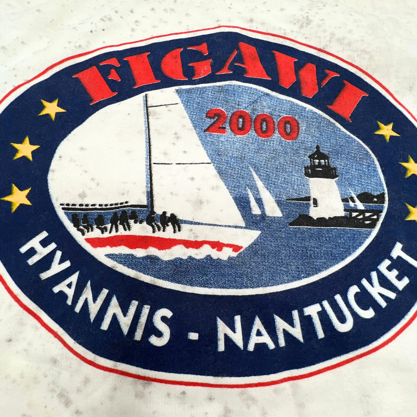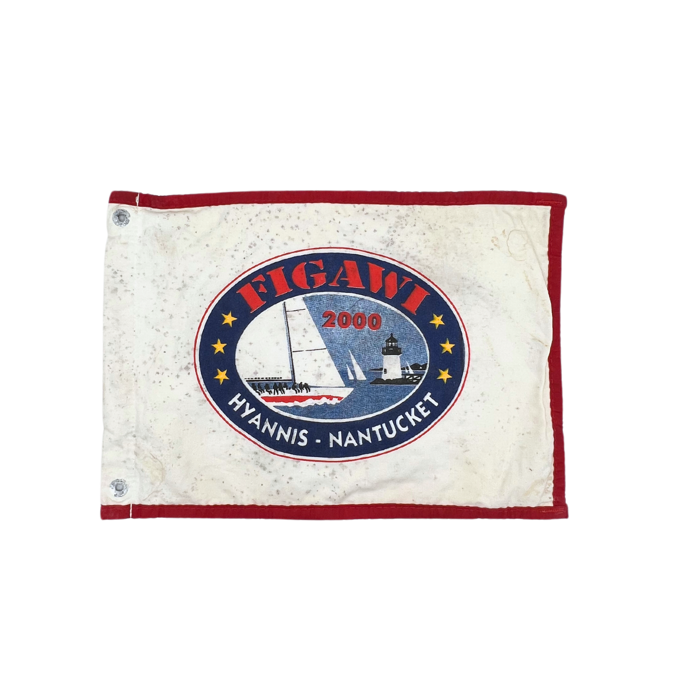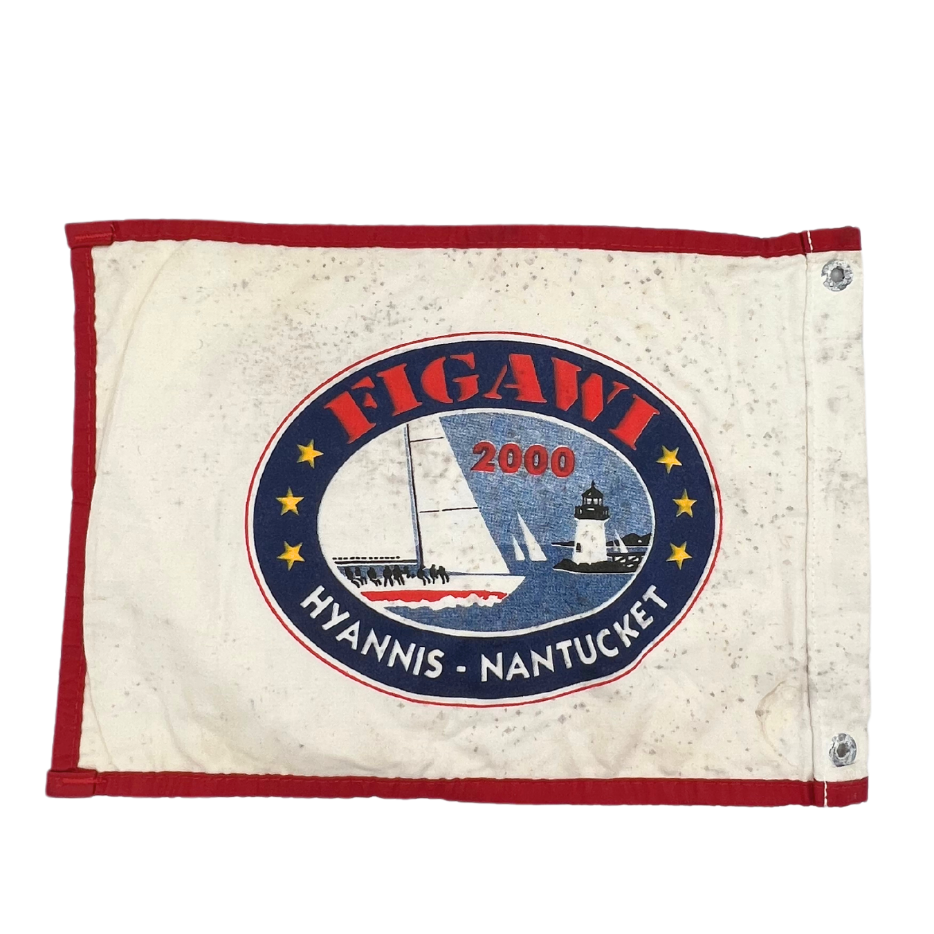 Heavily weathered collectible burgee from the 2000 Figawi race from Hyannis to Nantucket. Made of heavy cotton. Noticeable discoloration/spots from being left outdoors - see photos. Approximately 18" x 13".