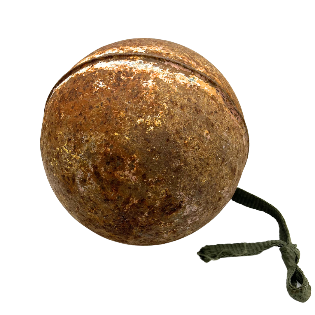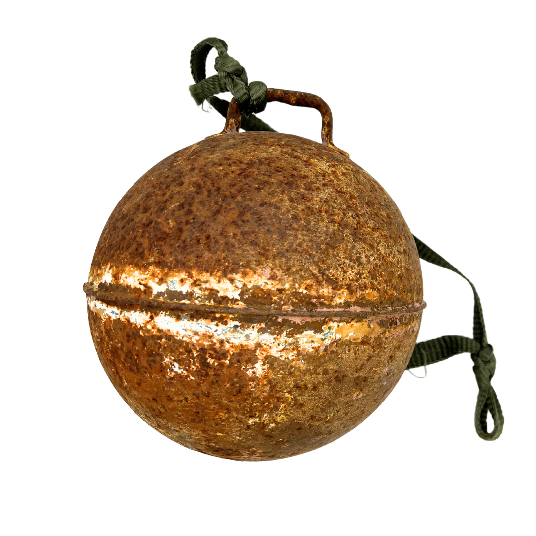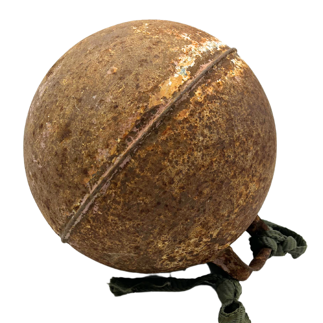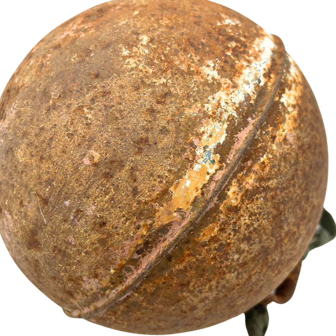 Vintage weathered metal buoy. Round fishing buoy with top handle and weathered cord. Buoy is approximately 8" in diameter.